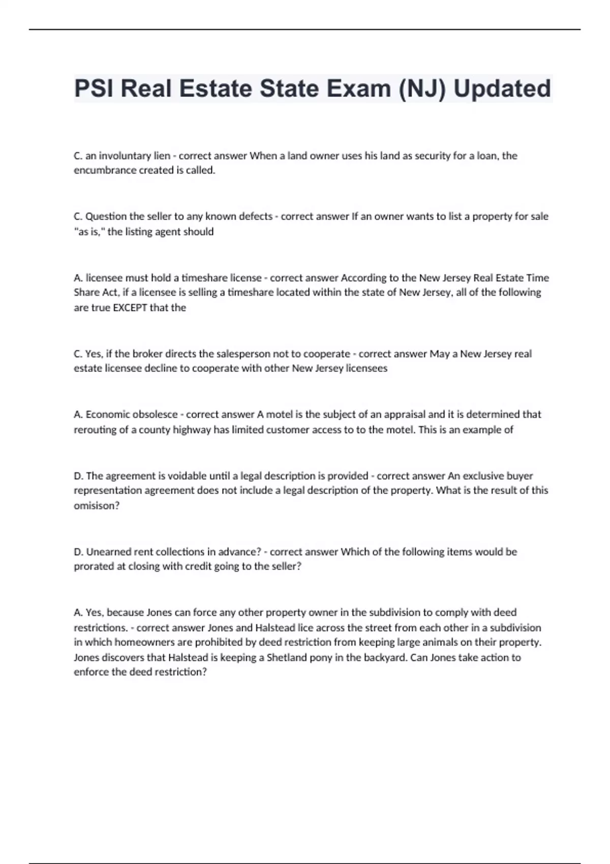 PSI Real Estate State Exam (NJ) Updated C. an involuntary lien - correct answer When a land owner uses his land as security for a loan, the encumbrance created is called. C. Question the seller to any known defects - correct answer If an owner wants to list a property for sale "as is," the listing agent should A. licensee must hold a timeshare license - correct answer According to the New Jersey Real Estate Time Share Act, if a licensee is selling a timeshare located within the state of New Jersey, all of the following are true EXCEPT that the C. Yes, if the broker directs the salesperson not to cooperate - correct answer May a New Jersey real estate licensee decline to cooperate with other New Jersey licensees A. Economic obsolesce - correct answer A motel is the subject of an appraisal and it is determined that rerouting of a county highway has limited customer access to to the motel. This is an example of D. The agreement is voidable until a legal description is provided - correct answer An exclusive buyer representation agreement does not include a legal description of the property. What is the result of this omisison? D. Unearned rent collections in advance? - correct answer Which of the following items would be prorated at closing with credit going to the seller? A. Yes, because Jones can force any other property owner in the subdivision to comply with deed restrictions. - correct answer Jones and Halstead lice across the street from each other in a subdivision in which homeowners are prohibited by deed restriction from keeping large animals on their property. Jones discovers that Halstead is keeping a Shetland pony in the backyard. Can Jones take action to enforce the deed restriction?