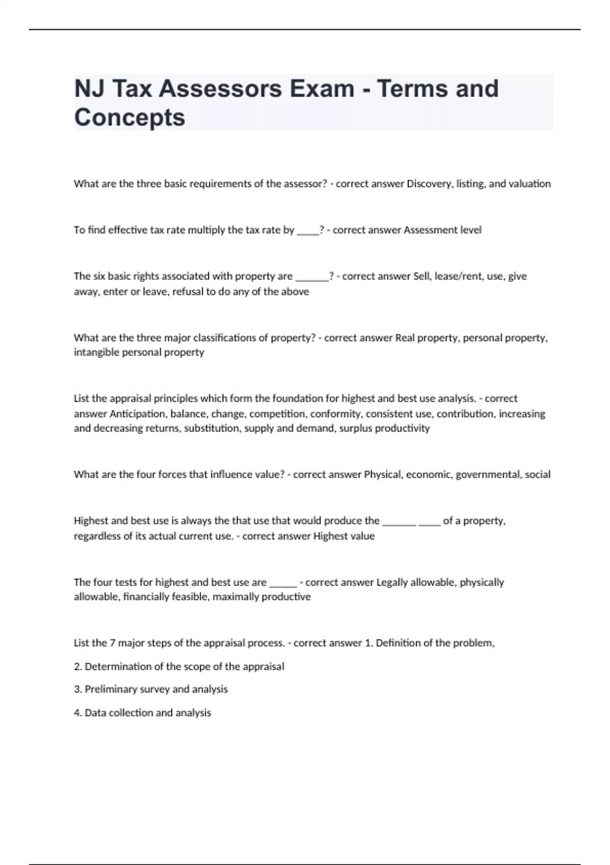 NJ Tax Assessors Exam - Terms and ConceptsWhat are the three basic requirements of the assessor? - correct answer Discovery, listing, and valuation To find effective tax rate multiply the tax rate by ____? - correct answer Assessment level The six basic rights associated with property are ______? - correct answer Sell, lease/rent, use, give away, enter or leave, refusal to do any of the above What are the three major classifications of property? - correct answer Real property, personal property, intangible personal property List the appraisal principles which form the foundation for highest and best use analysis. - correct answer Anticipation, balance, change, competition, conformity, consistent use, contribution, increasing and decreasing returns, substitution, supply and demand, surplus productivity What are the four forces that influence value? - correct answer Physical, economic, governmental, social Highest and best use is always the that use that would produce the ______ ____ of a property, regardless of its actual current use. - correct answer Highest value The four tests for highest and best use are _____ - correct answer Legally allowable, physically allowable, financially feasible, maximally productive List the 7 major steps of the appraisal process. - correct answer 1. Definition of the problem, 2. Determination of the scope of the appraisal 3. Preliminary survey and analysis 4. Data collection and analysis