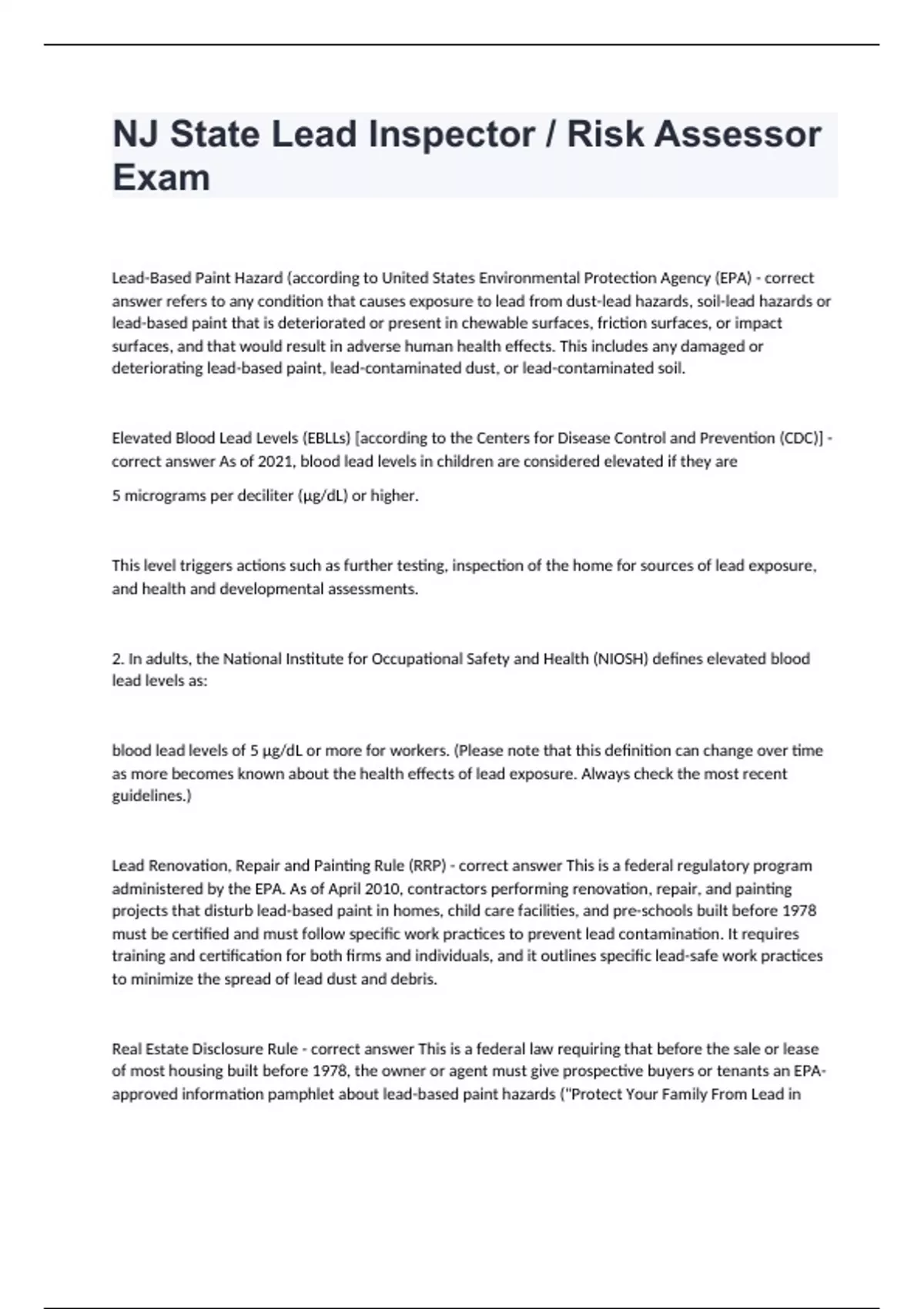 NJ State Lead Inspector / Risk Assessor ExamLead-Based Paint Hazard (according to United States Environmental Protection Agency (EPA) - correct answer refers to any condition that causes exposure to lead from dust-lead hazards, soil-lead hazards or lead-based paint that is deteriorated or present in chewable surfaces, friction surfaces, or impact surfaces, and that would result in adverse human health effects. This includes any damaged or deteriorating lead-based paint, lead-contaminated dust, or lead-contaminated soil. Elevated Blood Lead Levels (EBLLs) [according to the Centers for Disease Control and Prevention (CDC)] - correct answer As of 2021, blood lead levels in children are considered elevated if they are 5 micrograms per deciliter (µg/dL) or higher. This level triggers actions such as further testing, inspection of the home for sources of lead exposure, and health and developmental assessments. 2. In adults, the National Institute for Occupational Safety and Health (NIOSH) defines elevated blood lead levels as: blood lead levels of 5 µg/dL or more for workers. (Please note that this definition can change over time as more becomes known about the health effects of lead exposure. Always check the most recent guidelines.) Lead Renovation, Repair and Painting Rule (RRP) - correct answer This is a federal regulatory program administered by the EPA. As of April 2010, contractors performing renovation, repair, and painting projects that disturb lead-based paint in homes, child care facilities, and pre-schools built before 1978 must be certified and must follow specific work practices to prevent lead contamination. It requires training and certification for both firms and individuals, and it outlines specific lead-safe work practices to minimize the spread of lead dust and debris. Real Estate Disclosure Rule - correct answer This is a federal law requiring that before the sale or lease of most housing built before 1978, the owner or agent must give prospective buyers or tenants an EPA-approved information pamphlet about lead-based paint hazards ("Protect Your Family From Lead in