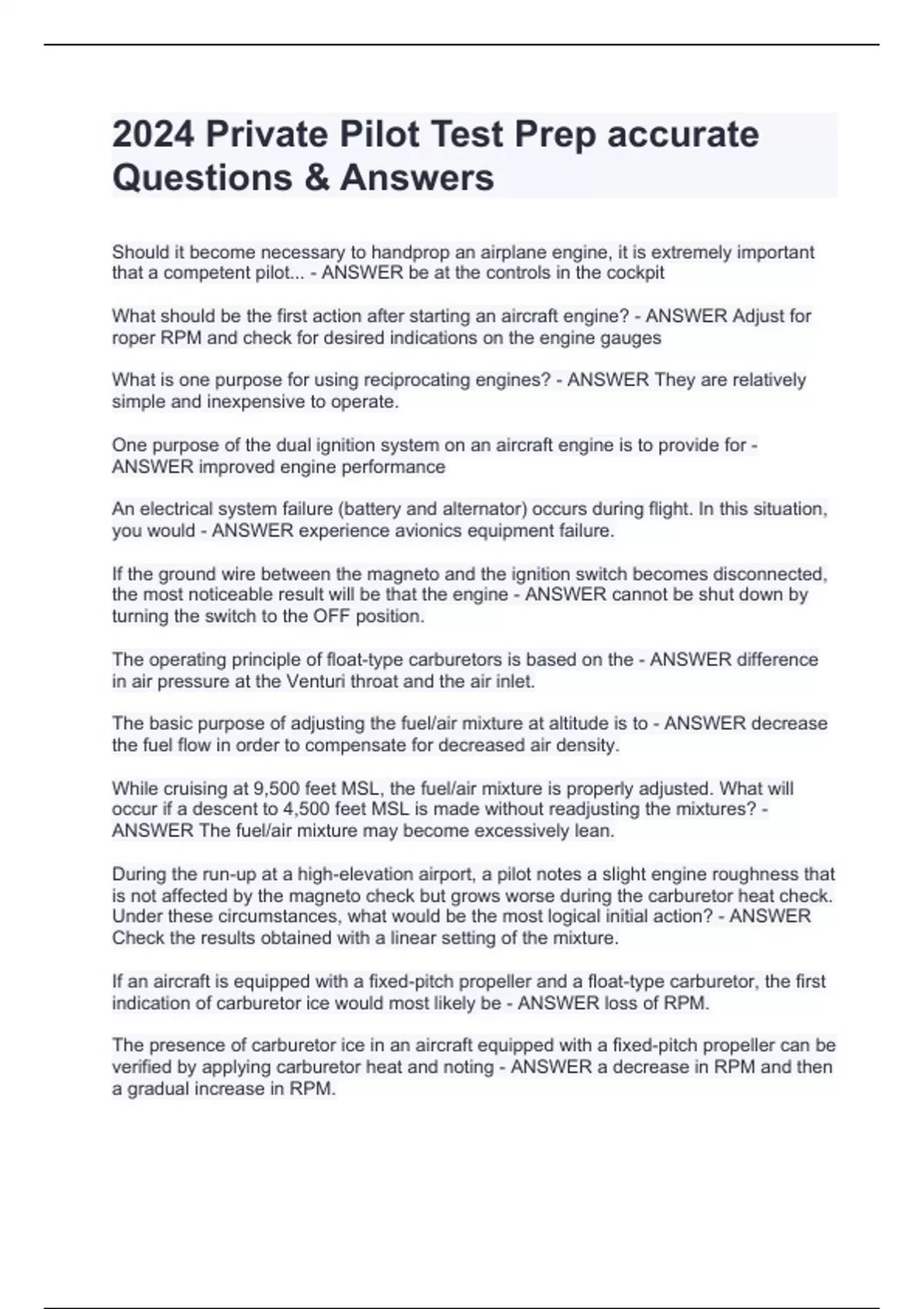 2024 Private Pilot Test Prep accurate Questions & Answers Should it become necessary to handprop an airplane engine, it is extremely important that a competent pilot... - ANSWER be at the controls in the cockpit What should be the first action after starting an aircraft engine? - ANSWER Adjust for roper RPM and check for desired indications on the engine gauges What is one purpose for using reciprocating engines? - ANSWER They are relatively simple and inexpensive to operate. One purpose of the dual ignition system on an aircraft engine is to provide for - ANSWER improved engine performance An electrical system failure (battery and alternator) occurs during flight. In this situation, you would - ANSWER experience avionics equipment failure. If the ground wire between the magneto and the ignition switch becomes disconnected, the most noticeable result will be that the engine - ANSWER cannot be shut down by turning the switch to the OFF position. The operating principle of float-type carburetors is based on the - ANSWER difference in air pressure at the Venturi throat and the air inlet. The basic purpose of adjusting the fuel/air mixture at altitude is to - ANSWER decrease the fuel flow in order to compensate for decreased air density. While cruising at 9,500 feet MSL, the fuel/air mixture is properly adjusted. What will occur if a descent to 4,500 feet MSL is made without readjusting the mixtures? - ANSWER The fuel/air mixture may become excessively lean. During the run-up at a high-elevation airport, a pilot notes a slight engine roughness that is not affected by the magneto check but grows worse during the carburetor heat check. Under these circumstances, what would be the most logical initial action? - ANSWER Check the results obtained with a linear setting of the mixture. If an aircraft is equipped with a fixed-pitch propeller and a float-type carburetor, the first indication of carburetor ice would most likely be - ANSWER loss of RPM. The presence of carburetor ice in an aircraft equipped with a fixed-pitch propeller can be verified by applying carburetor heat and noting - ANSWER a decrease in RPM and then a gradual increase in RPM. Which condition is most favorable to the development of carburetor icing? - ANSWER Temperature between 20 and 70°F and high humidity. The possibility of carburetor icing exists even when the ambient air temperature is as - ANSWER high as 70°F and the relative humidity is high. Carburetor icing can occur with an OAT as high as - ANSWER 20°C and high relative humidity. Applying carburetor heat will - ANSWER enrich the fuel/air mixture. What change occurs in the fuel/air mixture when carburetor heat is applied? - ANSWER The mixture becomes richer. Generally speaking, the use of carburetor heat tends to - ANSWER decrease engine performance. With regard to carburetor ice, float-type carburetor systems in comparison to fuel injection systems are generally considered to be - ANSWER more susceptible to icing. On aircraft equipped with fuel pumps, when is the auxiliary electric driven pump used? - ANSWER In the event engine-driven fuel pump fails. If the grade of fuel used in an aircraft engine is lower than specified for the engine, it will most likely cause - ANSWER detonation. Detonation may occur at high-power settings when - ANSWER the fuel mixture ignites instantaneously instead of burning progressively and evenly. Detonation occurs in a reciprocating aircraft engine when - ANSWER the unburned charge in the cylinders explodes instead of burning normally. The uncontrolled firing of the fuel/air charge in advance of normal spark ignition is known as - ANSWER pre-ignition. What type fuel can be substituted for an aircraft if the recommended octane is not available? - ANSWER The next higher octane aviation gas. Filling the fuel tanks after the last flight of the day is considered a good operating procedure because this will - ANSWER prevent moisture condensation by eliminating airspace in the tanks. To properly purge water from the fuel system of an aircraft equipped with fuel tank sumps and a fuel strainer quick drain, it is necessary to drain fuel from the - ANSWER fuel strainer drain and the fuel tank stumps. If a pilot suspects that the engine (with a fixed-pitch propeller) is detonating during climb-out after takeoff, the initial corrective action to take would be to - ANSWER lower the Mose slightly to increase airspeed. Excessively high engine temperatures will - ANSWER cause loss of power, excessive oil consumption, and possible permanent internal engine damage. Excessively high engine temperatures, either in the air or on the ground, will - ANSWER cause loss of power, excessive oil consumption, and possible permanent internal engine damage. If the engine oil temperature and cylinder head temperature gauges have exceeded their normal operating range, the pilot may have been operating with - ANSWER too much power and with the mixture set too lean. Which would most likely cause the cylinder head temperature and engine oil temperature gauges to exceed their normal operating ranges? - ANSWER Using fuel that has a lower-than-specified fuel rating. For internal cooling, reciprocating aircraft engines are especially dependent on - ANSWER the circulation of lubricating oil. An abnormally high engine oil temperature indication may be caused by - ANSWER the oil level being too low. What action can a pilot take to aid in cooling an engine that is overheating during a climb? - ANSWER Reduce rate of climb and increase airspeed. What is one procedure to aid in cooling an engine that is overheating? - ANSWER Enrichen the fuel mixture. The most important rule to remember in the event of a power failure after becoming airborne is to - ANSWER immediately establish the proper gliding attitude and airspeed. How is engine operation controlled on an engine equipped with a constant-speed prop