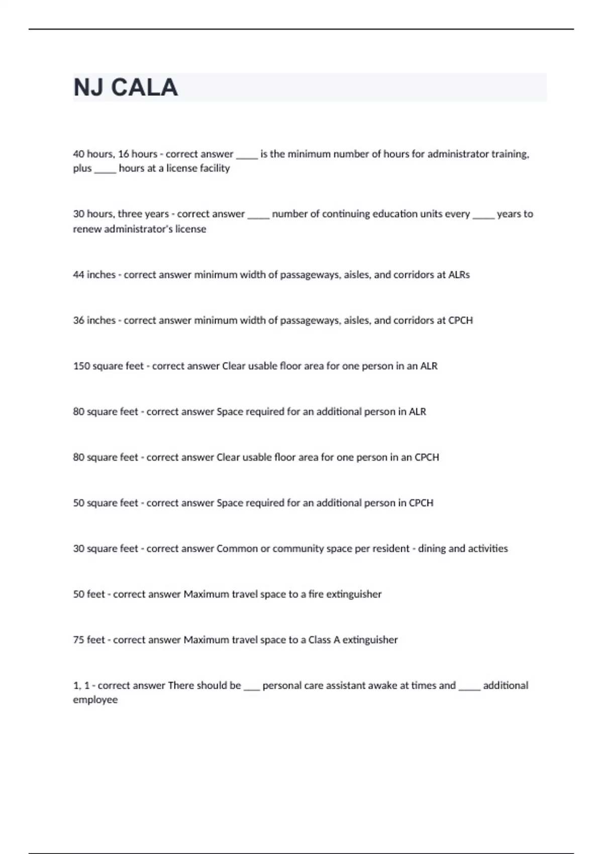 NJ CALA 40 hours, 16 hours - correct answer ____ is the minimum number of hours for administrator training, plus ____ hours at a license facility 30 hours, three years - correct answer ____ number of continuing education units every ____ years to renew administrator's license 44 inches - correct answer minimum width of passageways, aisles, and corridors at ALRs 36 inches - correct answer minimum width of passageways, aisles, and corridors at CPCH 150 square feet - correct answer Clear usable floor area for one person in an ALR 80 square feet - correct answer Space required for an additional person in ALR 80 square feet - correct answer Clear usable floor area for one person in an CPCH 50 square feet - correct answer Space required for an additional person in CPCH 30 square feet - correct answer Common or community space per resident - dining and activities 50 feet - correct answer Maximum travel space to a fire extinguisher 75 feet - correct answer Maximum travel space to a Class A extinguisher 1, 1 - correct answer There should be ___ personal care assistant awake at times and ____ additional employee