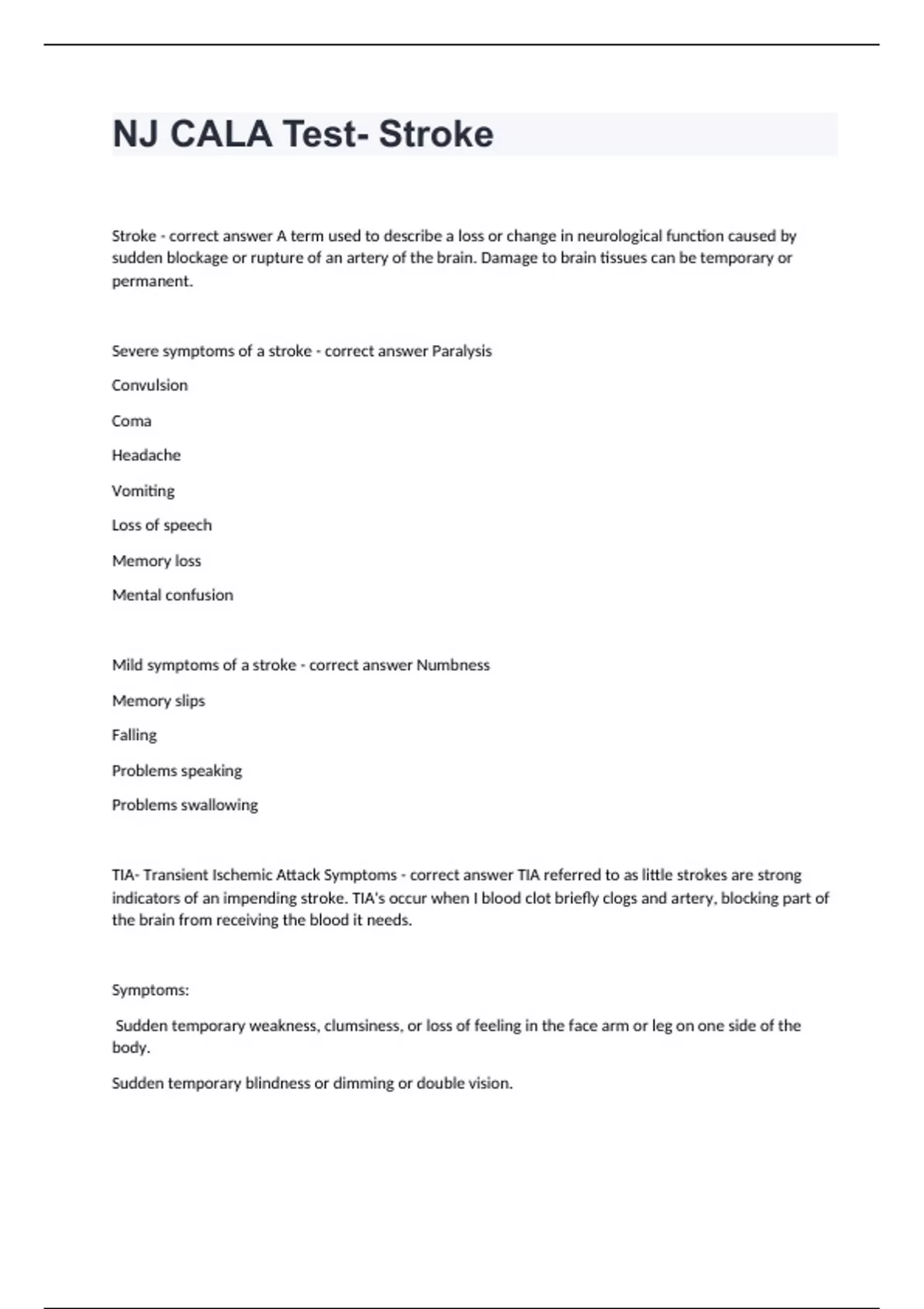 NJ CALA Test- StrokeStroke - correct answer A term used to describe a loss or change in neurological function caused by sudden blockage or rupture of an artery of the brain. Damage to brain tissues can be temporary or permanent. Severe symptoms of a stroke - correct answer Paralysis Convulsion Coma Headache Vomiting Loss of speech Memory loss Mental confusion Mild symptoms of a stroke - correct answer Numbness Memory slips Falling Problems speaking Problems swallowing TIA- Transient Ischemic Attack Symptoms - correct answer TIA referred to as little strokes are strong indicators of an impending stroke. TIA's occur when I blood clot briefly clogs and artery, blocking part of the brain from receiving the blood it needs. Symptoms: Sudden temporary weakness, clumsiness, or loss of feeling in the face arm or leg on one side of the body. Sudden temporary blindness or dimming or double vision.