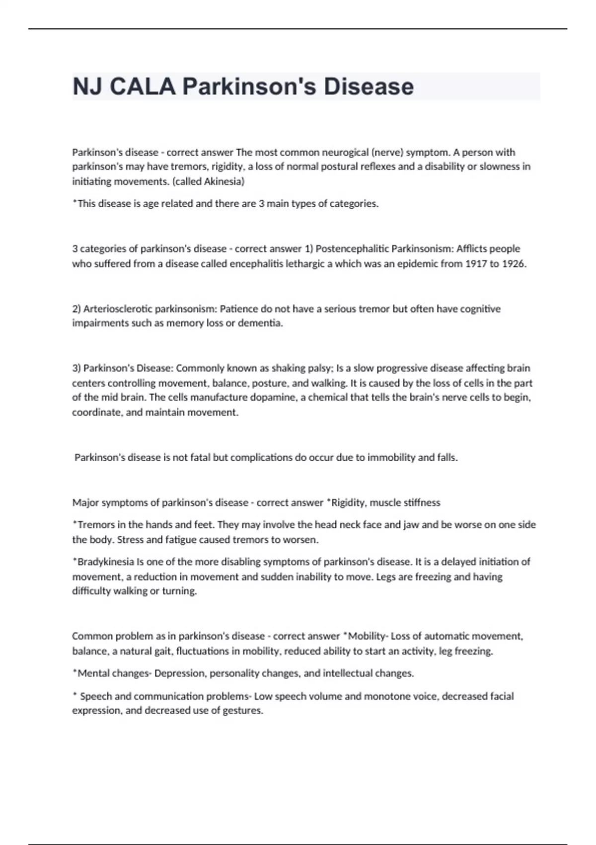 NJ CALA Parkinson's DiseaseParkinson's disease - correct answer The most common neurogical (nerve) symptom. A person with parkinson's may have tremors, rigidity, a loss of normal postural reflexes and a disability or slowness in initiating movements. (called Akinesia) *This disease is age related and there are 3 main types of categories. 3 categories of parkinson's disease - correct answer 1) Postencephalitic Parkinsonism: Afflicts people who suffered from a disease called encephalitis lethargic a which was an epidemic from 1917 to 1926. 2) Arteriosclerotic parkinsonism: Patience do not have a serious tremor but often have cognitive impairments such as memory loss or dementia. 3) Parkinson's Disease: Commonly known as shaking palsy; Is a slow progressive disease affecting brain centers controlling movement, balance, posture, and walking. It is caused by the loss of cells in the part of the mid brain. The cells manufacture dopamine, a chemical that tells the brain's nerve cells to begin, coordinate, and maintain movement. Parkinson's disease is not fatal but complications do occur due to immobility and falls. Major symptoms of parkinson's disease - correct answer *Rigidity, muscle stiffness *Tremors in the hands and feet. They may involve the head neck face and jaw and be worse on one side the body. Stress and fatigue caused tremors to worsen. *Bradykinesia Is one of the more disabling symptoms of parkinson's disease. It is a delayed initiation of movement, a reduction in movement and sudden inability to move. Legs are freezing and having difficulty walking or turning. Common problem as in parkinson's disease - correct answer *Mobility- Loss of automatic movement, balance, a natural gait, fluctuations in mobility, reduced ability to start an activity, leg freezing. *Mental changes- Depression, personality changes, and intellectual changes. * Speech and communication problems- Low speech volume and monotone voice, decreased facial expression, and decreased use of gestures.