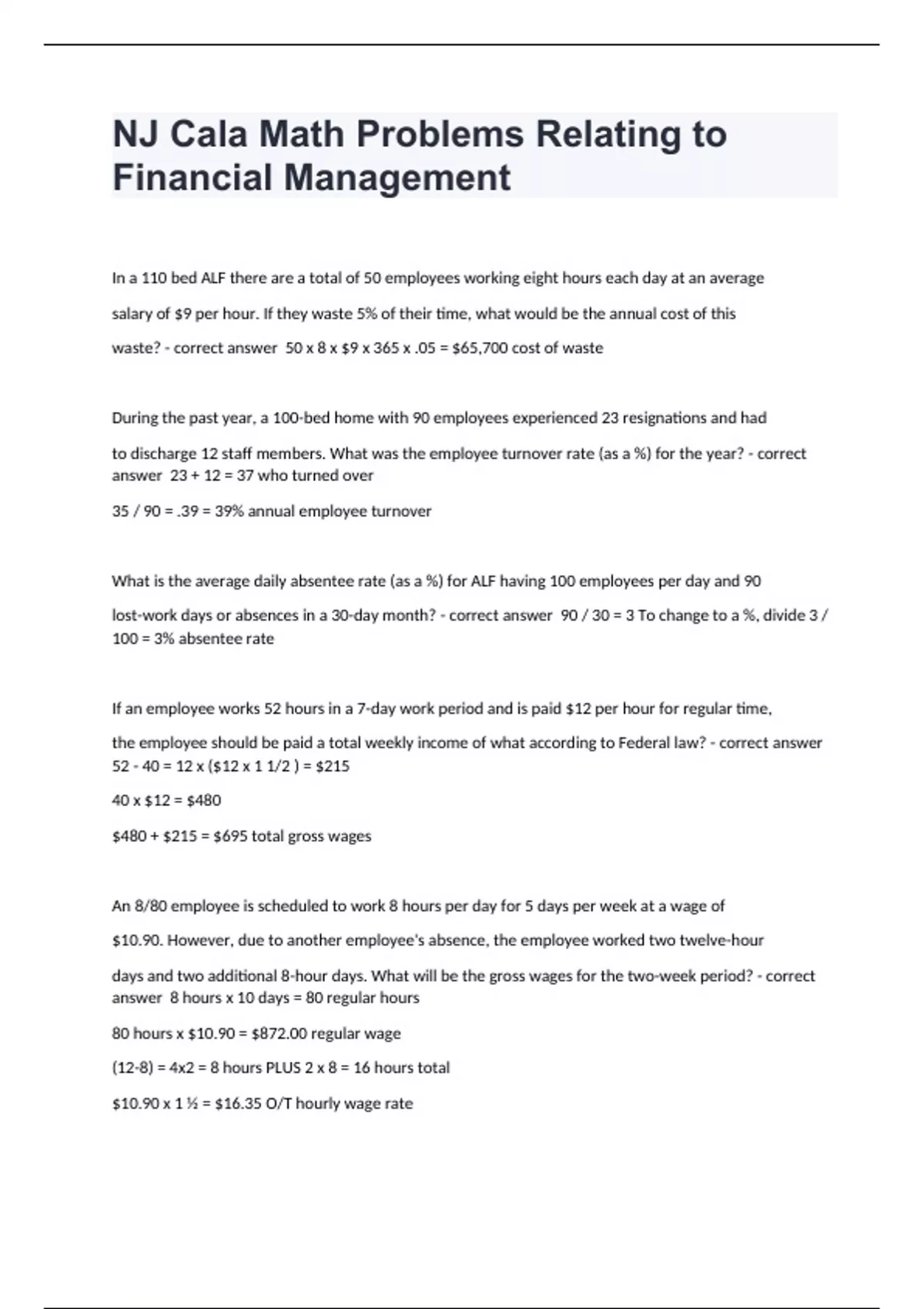 NJ Cala Math Problems Relating to Financial ManagementIn a 110 bed ALF there are a total of 50 employees working eight hours each day at an average salary of $9 per hour. If they waste 5% of their time, what would be the annual cost of this waste? - correct answer 50 x 8 x $9 x 365 x .05 = $65,700 cost of waste During the past year, a 100-bed home with 90 employees experienced 23 resignations and had to discharge 12 staff members. What was the employee turnover rate (as a %) for the year? - correct answer 23 + 12 = 37 who turned over 35 / 90 = .39 = 39% annual employee turnover What is the average daily absentee rate (as a %) for ALF having 100 employees per day and 90 lost-work days or absences in a 30-day month? - correct answer 90 / 30 = 3 To change to a %, divide 3 / 100 = 3% absentee rate If an employee works 52 hours in a 7-day work period and is paid $12 per hour for regular time, the employee should be paid a total weekly income of what according to Federal law? - correct answer 52 - 40 = 12 x ($12 x 1 1/2 ) = $215 40 x $12 = $480 $480 + $215 = $695 total gross wages An 8/80 employee is scheduled to work 8 hours per day for 5 days per week at a wage of $10.90. However, due to another employee's absence, the employee worked two twelve-hour days and two additional 8-hour days. What will be the gross wages for the two-week period? - correct answer 8 hours x 10 days = 80 regular hours 80 hours x $10.90 = $872.00 regular wage (12-8) = 4x2 = 8 hours PLUS 2 x 8 = 16 hours total $10.90 x 1 ½ = $16.35 O/T hourly wage rate