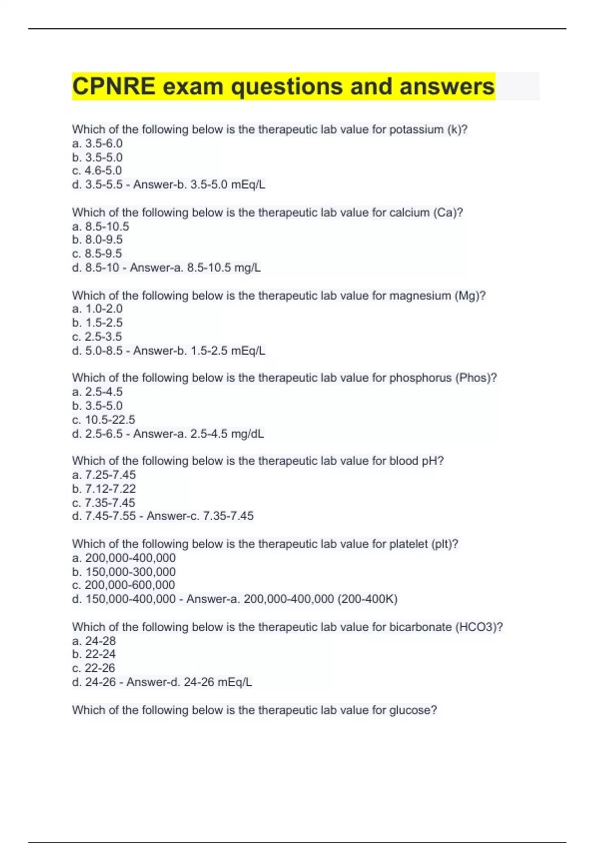 Which of the following below is the therapeutic lab value for potassium (k)? a. 3.5-6.0 b. 3.5-5.0 c. 4.6-5.0 d. 3.5-5.5 - Answer-b. 3.5-5.0 mEq/L Which of the following below is the therapeutic lab value for calcium (Ca)? a. 8.5-10.5 b. 8.0-9.5 c. 8.5-9.5 d. 8.5-10 - Answer-a. 8.5-10.5 mg/L Which of the following below is the therapeutic lab value for magnesium (Mg)? a. 1.0-2.0 b. 1.5-2.5 c. 2.5-3.5 d. 5.0-8.5 - Answer-b. 1.5-2.5 mEq/L Which of the following below is the therapeutic lab value for phosphorus (Phos)? a. 2.5-4.5 b. 3.5-5.0 c. 10.5-22.5 d. 2.5-6.5 - Answer-a. 2.5-4.5 mg/dL Which of the following below is the therapeutic lab value for blood pH? a. 7.25-7.45 b. 7.12-7.22 c. 7.35-7.45 d. 7.45-7.55 - Answer-c. 7.35-7.45 Which of the following below is the therapeutic lab value for platelet (plt)? a. 200,000-400,000 b. 150,000-300,000 c. 200,000-600,000 d. 150,000-400,000 - Answer-a. 200,000-400,000 (200-400K) Which of the following below is the therapeutic lab value for bicarbonate (HCO3)? a. 24-28 b. 22-24 c. 22-26 d. 24-26 - Answer-d. 24-26 mEq/L Which of the following below is the therapeutic lab value for glucose?