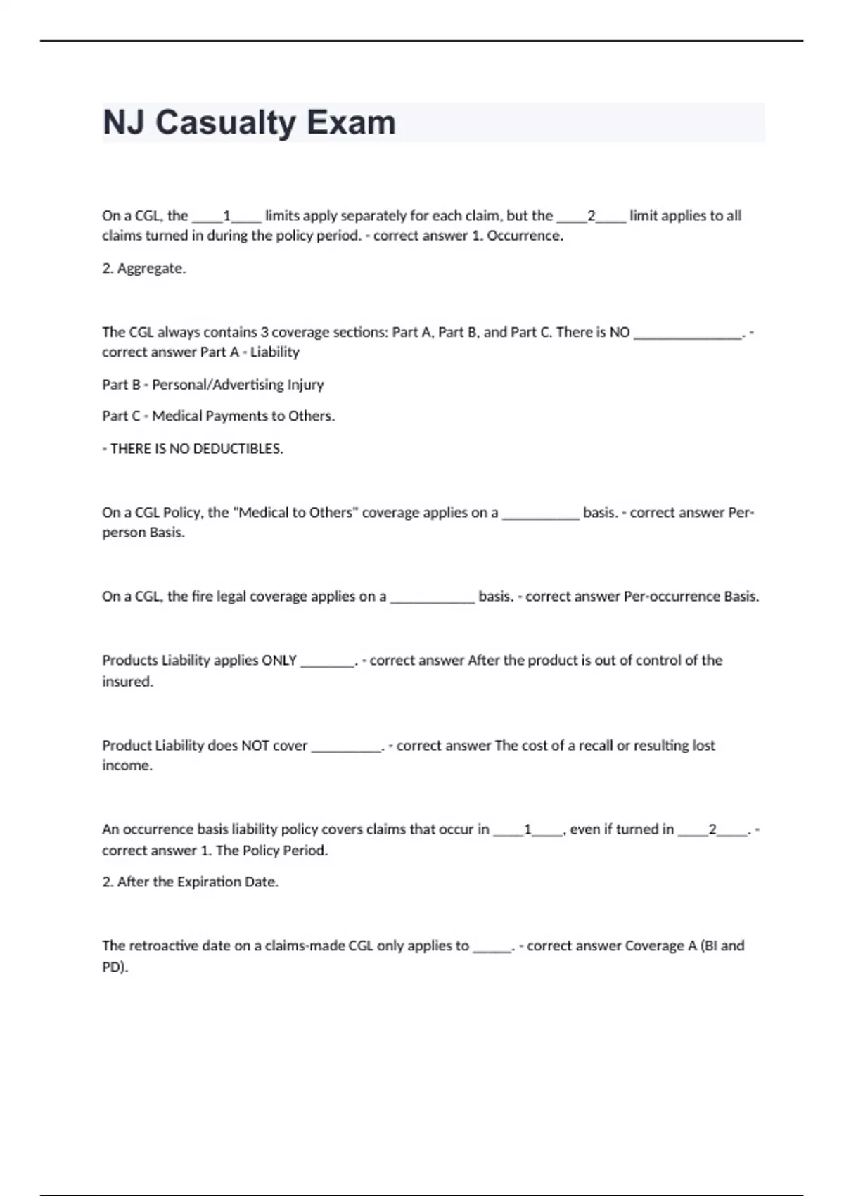 NJ Casualty ExamOn a CGL, the ____1____ limits apply separately for each claim, but the ____2____ limit applies to all claims turned in during the policy period. - correct answer 1. Occurrence. 2. Aggregate. The CGL always contains 3 coverage sections: Part A, Part B, and Part C. There is NO ______________. - correct answer Part A - Liability Part B - Personal/Advertising Injury Part C - Medical Payments to Others. - THERE IS NO DEDUCTIBLES. On a CGL Policy, the "Medical to Others" coverage applies on a __________ basis. - correct answer Per-person Basis. On a CGL, the fire legal coverage applies on a ___________ basis. - correct answer Per-occurrence Basis. Products Liability applies ONLY _______. - correct answer After the product is out of control of the insured. Product Liability does NOT cover _________. - correct answer The cost of a recall or resulting lost income. An occurrence basis liability policy covers claims that occur in ____1____, even if turned in ____2____. - correct answer 1. The Policy Period. 2. After the Expiration Date. The retroactive date on a claims-made CGL only applies to _____. - correct answer Coverage A (BI and PD).