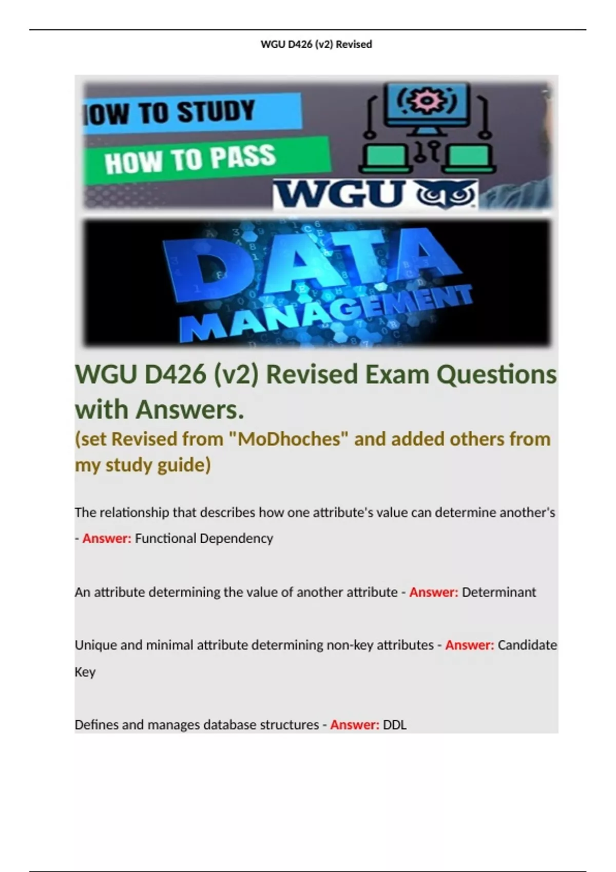 WGU D426 (v2) Revised Exam Questions with Answers. (set Revised from "MoDhoches" and added others from my study guide) Terms like: The relationship that describes how one attribute's value can determine another's - Answer: Functional Dependency