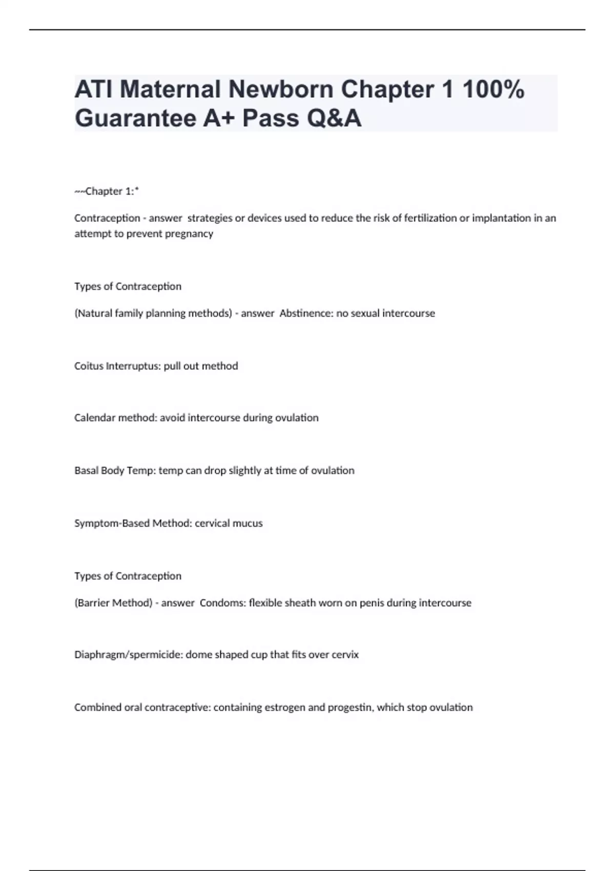 ATI MaChapter 1: Contraception strategies or devices used to reduce the risk of fertilization or implantation in an attempt to prevent pregnancy Types of Contraception (Natural family planning methods) Abstinence: no sexual intercourse Coitus Interruptus: pull out method Calendar method: avoid intercourse during ovulation Basal Body Temp: temp can drop slightly at time of ovulation Symptom-Based Method: cervical mucus Types of Contraception (Barrier Method) Condoms: flexible sheath worn on penis during intercourse Diaphragm/spermicide: dome shaped cup that fits over cervix Combined oral contraceptive: containing estrogen and progestin, which stop ovulation Morning after pill: prevents fertilization Transdermal patch: progesterone and estradiol delivered into skin Injectable progestins: injections for females every 11-13 weeks Nuvaring: estonogestrel and estradiol delivered at continuous levels vaginally Implantable Progestin (Implanon): procedure place on upper aspect of arm IUD: T-shaped chemical device inserted into cervix, place in uterus that releases a chemical damaging sperm may be a good idea for women with thrombophlebitisternal Newborn Chapter 1 100% Guarantee A+ Pass Q&A