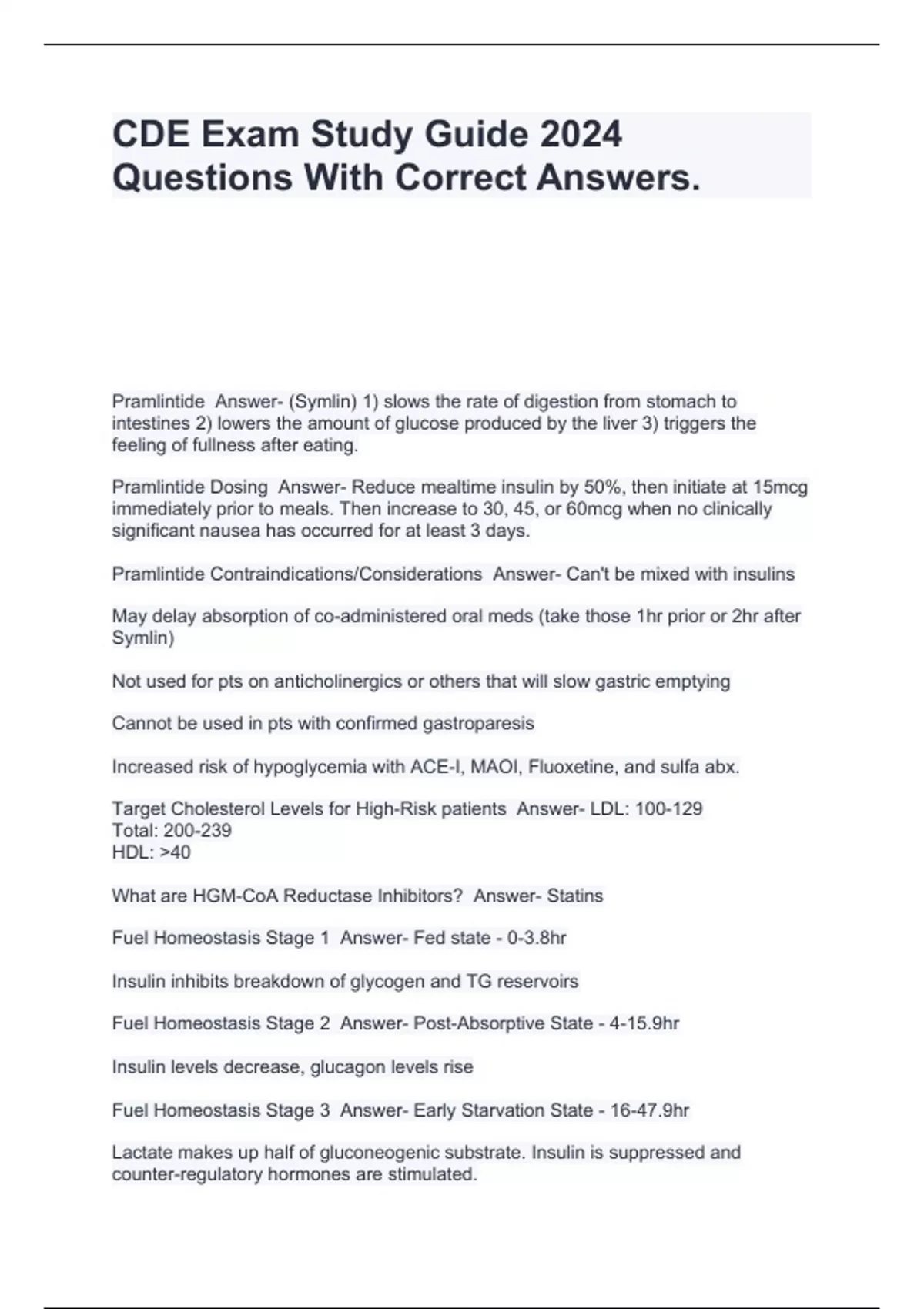 Pramlintide (Symlin) 1) slows the rate of digestion from stomach to intestines 2) lowers the amount of glucose produced by the liver 3) triggers the feeling of fullness after eating. Pramlintide Dosing Reduce mealtime insulin by 50%, then initiate at 15mcg immediately prior to meals. Then increase to 30, 45, or 60mcg when no clinically significant nausea has occurred for at least 3 days. Pramlintide Contraindications/Considerations Can't be mixed with insulins May delay absorption of co-administered oral meds (take those 1hr prior or 2hr after Symlin) Not used for pts on anticholinergics or others that will slow gastric emptying Cannot be used in pts with confirmed gastroparesis Increased risk of hypoglycemia with ACE-I, MAOI, Fluoxetine, and sulfa abx. Target Cholesterol Levels for High-Risk patients LDL: 100-129 Total: 200-239 HDL: >40 What are HGM-CoA Reductase Inhibitors? StatinsCDE Exam Study Guide 2024 Questions With Correct Answers.