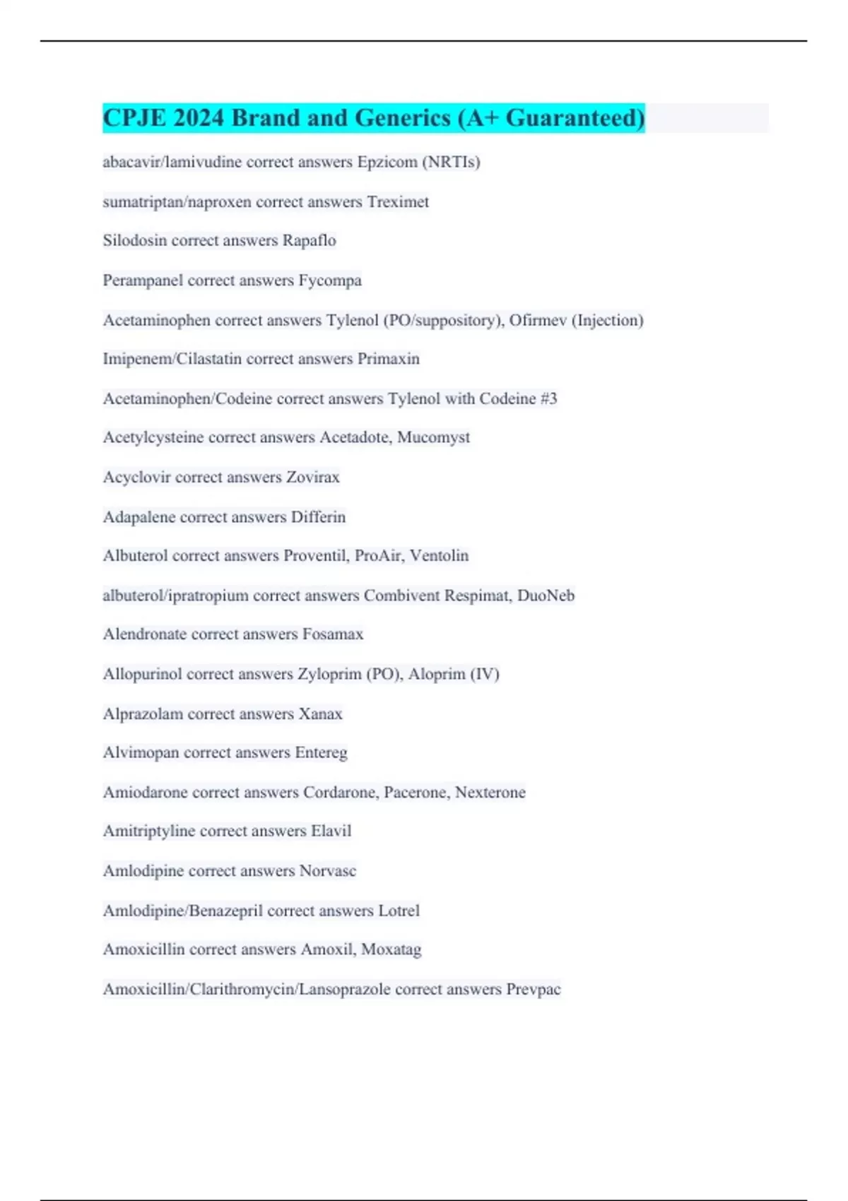 abacavir/lamivudine correct answers Epzicom (NRTIs) sumatriptan/naproxen correct answers Treximet Silodosin correct answers Rapaflo Perampanel correct answers Fycompa Acetaminophen correct answers Tylenol (PO/suppository), Ofirmev (Injection) Imipenem/Cilastatin correct answers Primaxin Acetaminophen/Codeine correct answers Tylenol with Codeine #3 Acetylcysteine correct answers Acetadote, Mucomyst Acyclovir correct answers Zovirax Adapalene correct answers Differin Albuterol correct answers Proventil, ProAir, Ventolin albuterol/ipratropium correct answers Combivent Respimat, DuoNeb Alendronate correct answers Fosamax Allopurinol correct answers Zyloprim (PO), Aloprim (IV) Alprazolam correct answers Xanax Alvimopan correct answers Entereg Amiodarone correct answers Cordarone, Pacerone, Nexterone Amitriptyline correct answers Elavil Amlodipine correct answers Norvasc Amlodipine/Benazepril correct answers Lotrel Amoxicillin correct answers Amoxil, Moxatag Amoxicillin/Clarithromycin/Lansoprazole correct answers Prevpac