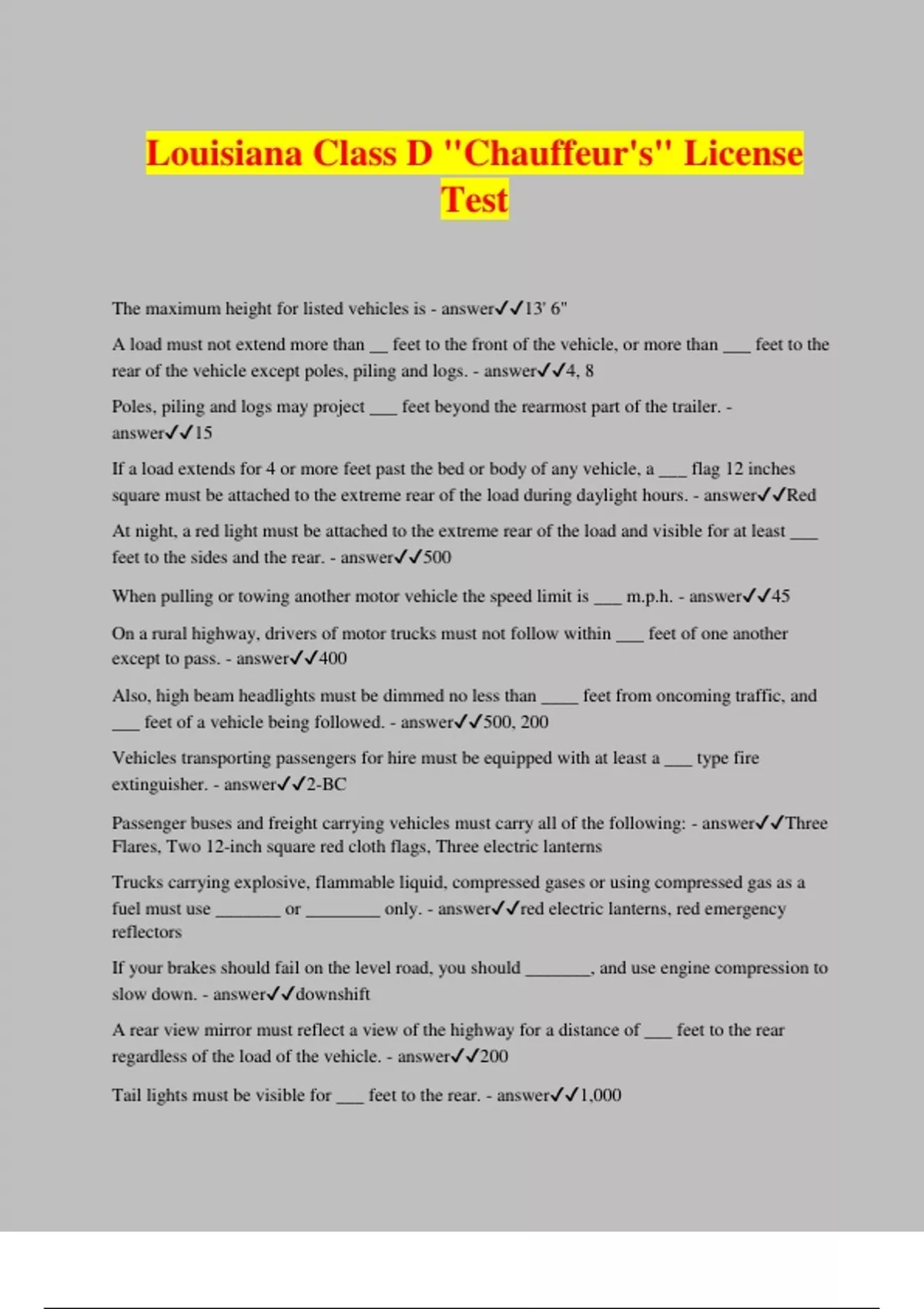 Louisiana Class D "Chauffeur's" License Test The maximum height for listed vehicles is - answer13' 6" A load must not extend more than __ feet to the front of the vehicle, or more than ___ feet to the rear of the vehicle except poles, piling and logs. - answer4, 8 Poles, piling and logs may project ___ feet beyond the rearmost part of the trailer. - answer15 If a load extends for 4 or more feet past the bed or body of any vehicle, a ___ flag 12 inches square must be attached to the extreme rear of the load during daylight hours. - answerRed At night, a red light must be attached to the extreme rear of the load and visible for at least ___ feet to the sides and the rear. - answer500 When pulling or towing another motor vehicle the speed limit is ___ m.p.h. - answer45 On a rural highway, drivers of motor trucks must not follow within ___ feet of one another except to pass. - answer400 Also, high beam headlights must be dimmed no less than ____ feet from oncoming traffic, and ___ feet of a vehicle being followed. - answer500, 200 Vehicles transporting passengers for hire must be equipped with at least a ___ type fire extinguisher. - answer2-BC Passenger buses and freight carrying vehicles must carry all of the following: - answerThree Flares, Two 12-inch square red cloth flags, Three electric lanterns Trucks carrying explosive, flammable liquid, compressed gases or using compressed gas as a fuel must use _______ or ________ only. - answerred electric lanterns, red emergency reflectors If your brakes should fail on the level road, you should _______, and use engine compression to slow down. - answerdownshift A rear view mirror must reflect a view of the highway for a distance of ___ feet to the rear regardless of the load of the vehicle. - answer200 Tail lights must be visible for ___ feet to the rear. - answer1,000 Reflectors must be visible for ___ feet. - answer600 Class D license is for anyone driving a vehicle or combined set of vehicles in this weight range _____, as long as they are not carrying hazardous materials - answer10,001-26,001 pounds A Class D license allows for a driver-for-fire to drive any vehicle fitting into the Class __ requirements - answerE you must be ____ years old to receive a class D license - answer17 the maximum width for all vehicles except buses is ___ - answer8 feet the maximum width for buses is ____ - answer8ft 6in the load may not project more than ___ beyond the width of the body - answer6in the maximum height for all vehicles is ___ - answer13ft 6in the maximum length for any single vehicle including its load is ___ - answer40ft the maximum length for a truck-tractor and trailer combination is ___ - answer65ft the maximum height, length, and width requirements do not apply to ____, ______, or ____ as long as they are operating during daylight - answerauto carriers, trailers hauling poles or pilings, trailers hauling logs when securing a load, the contents must not be allowed to ____, ____, _____, or ______ and the cover must be securely fastened - answerdrop, shift, leak, otherwise escape any load may not extend more than ____ in front of the vehicle - answer4ft any load except for poles, pilings, and logs may not extend more than ___ beyond the rear of the vehicle - answer8ft poles, pilings, and logs may not extend more than ___ beyond the rear of the trailer - answer15ft if a load extends more than ___ past the body of the vehicle a 12 in square _____ must be attached to the load during daylight and a ____ must be attached during nighttime - answer4 ft, red flag, red light the red light attached to the load at night must be visible from ____ - answer500ft when pulling or towing another motor vehicle the speed limit is _____ - answer45 mph the speed limit for school buses which are frequently stopping to load or unload children is ___ - answer35mp