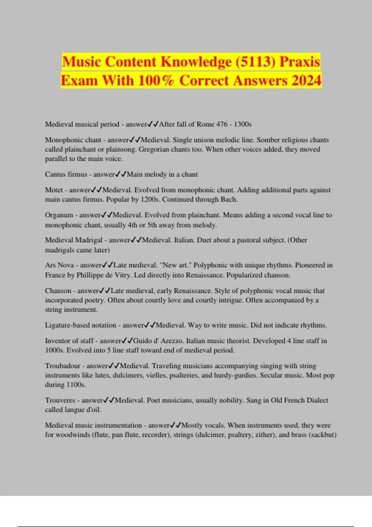 Music Content Knowledge (5113) Praxis Exam With 100% Correct Answers 2024 Medieval musical period - answerAfter fall of Rome 476 - 1300s Monophonic chant - answerMedieval. Single unison melodic line. Somber religious chants called plainchant or plainsong. Gregorian chants too. When other voices added, they moved parallel to the main voice. Cantus firmus - answerMain melody in a chant Motet - answerMedieval. Evolved from monophonic chant. Adding additional parts against main cantus firmus. Popular by 1200s. Continued through Bach. Organum - answerMedieval. Evolved from plainchant. Means adding a second vocal line to monophonic chant, usually 4th or 5th away from melody. Medieval Madrigal - answerMedieval. Italian. Duet about a pastoral subject. (Other madrigals came later) Ars Nova - answerLate medieval. "New art." Polyphonic with unique rhythms. Pioneered in France by Phillippe de Vitry. Led directly into Renaissance. Popularized chanson. Chanson - answerLate medieval, early Renaissance. Style of polyphonic vocal music that incorporated poetry. Often about courtly love and courtly intrigue. Often accompanied by a string instrument. Ligature-based notation - answerMedieval. Way to write music. Did not indicate rhythms. Inventor of staff - answerGuido d' Arezzo. Italian music theorist. Developed 4 line staff in 1000s. Evolved into 5 line staff toward end of medieval period. Troubadour - answerMedieval. Traveling musicians accompanying singing with string instruments like lutes, dulcimers, vielles, psalteries, and hurdy-gurdies. Secular music. Most pop during 1100s. Trouveres - answerMedieval. Poet musicians, usually nobility. Sang in Old French Dialect called langue d'oil. Medieval music instrumentation - answerMostly vocals. When instruments used, they were for woodwinds (flute, pan flute, recorder), strings (dulcimer,