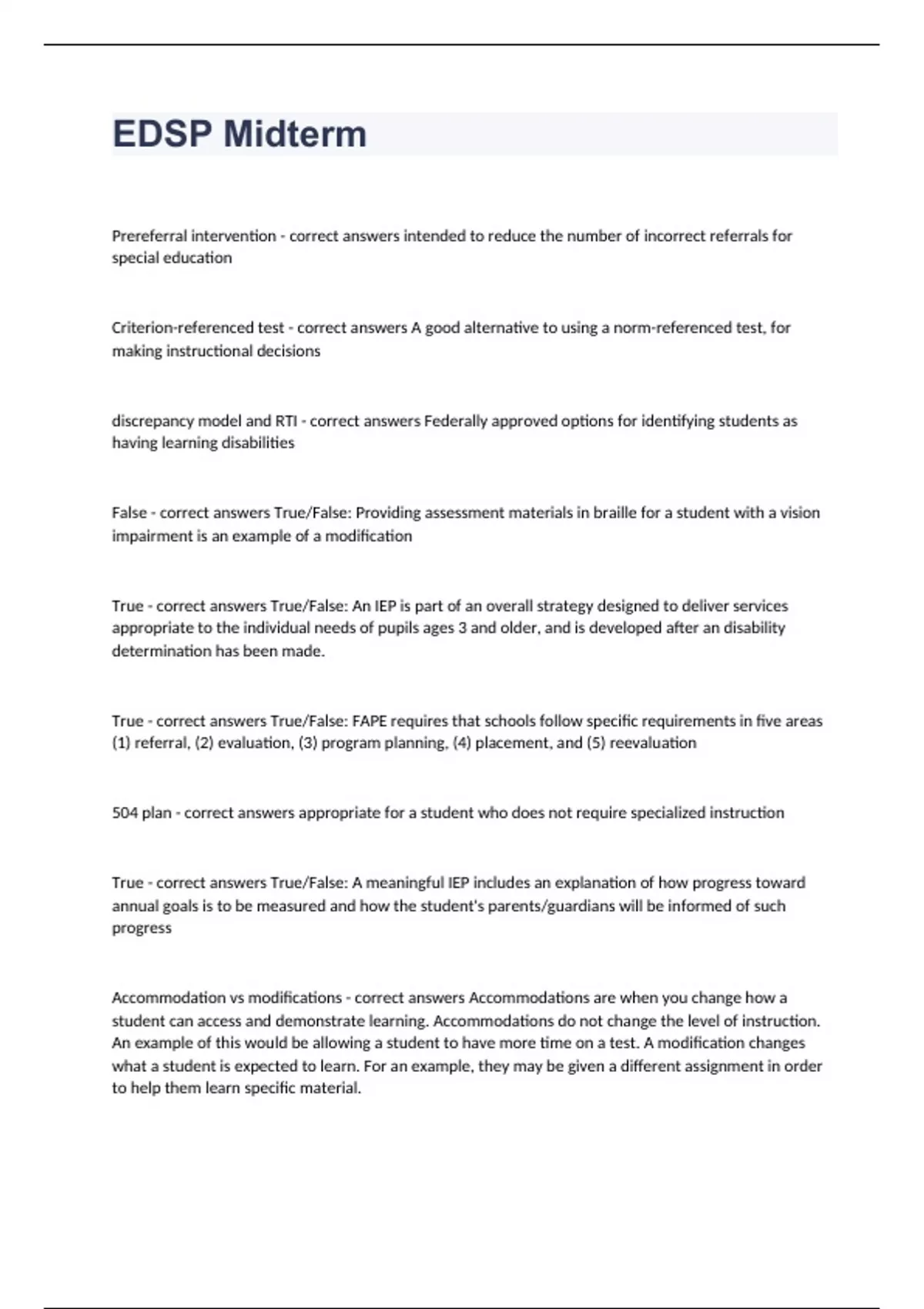 EDSP Midterm Question and answers 100% correct 2023/2024Prereferral intervention - correct answers intended to reduce the number of incorrect referrals for special education Criterion-referenced test - correct answers A good alternative to using a norm-referenced test, for making instructional decisions discrepancy model and RTI - correct answers Federally approved options for identifying students as having learning disabilities False - correct answers True/False: Providing assessment materials in braille for a student with a vision impairment is an example of a modification True - correct answers True/False: An IEP is part of an overall strategy designed to deliver services appropriate to the individual needs of pupils ages 3 and older, and is developed after an disability determination has been made. True - correct answers True/False: FAPE requires that schools follow specific requirements in five areas (1) referral, (2) evaluation, (3) program planning, (4) placement, and (5) reevaluation 504 plan - correct ans