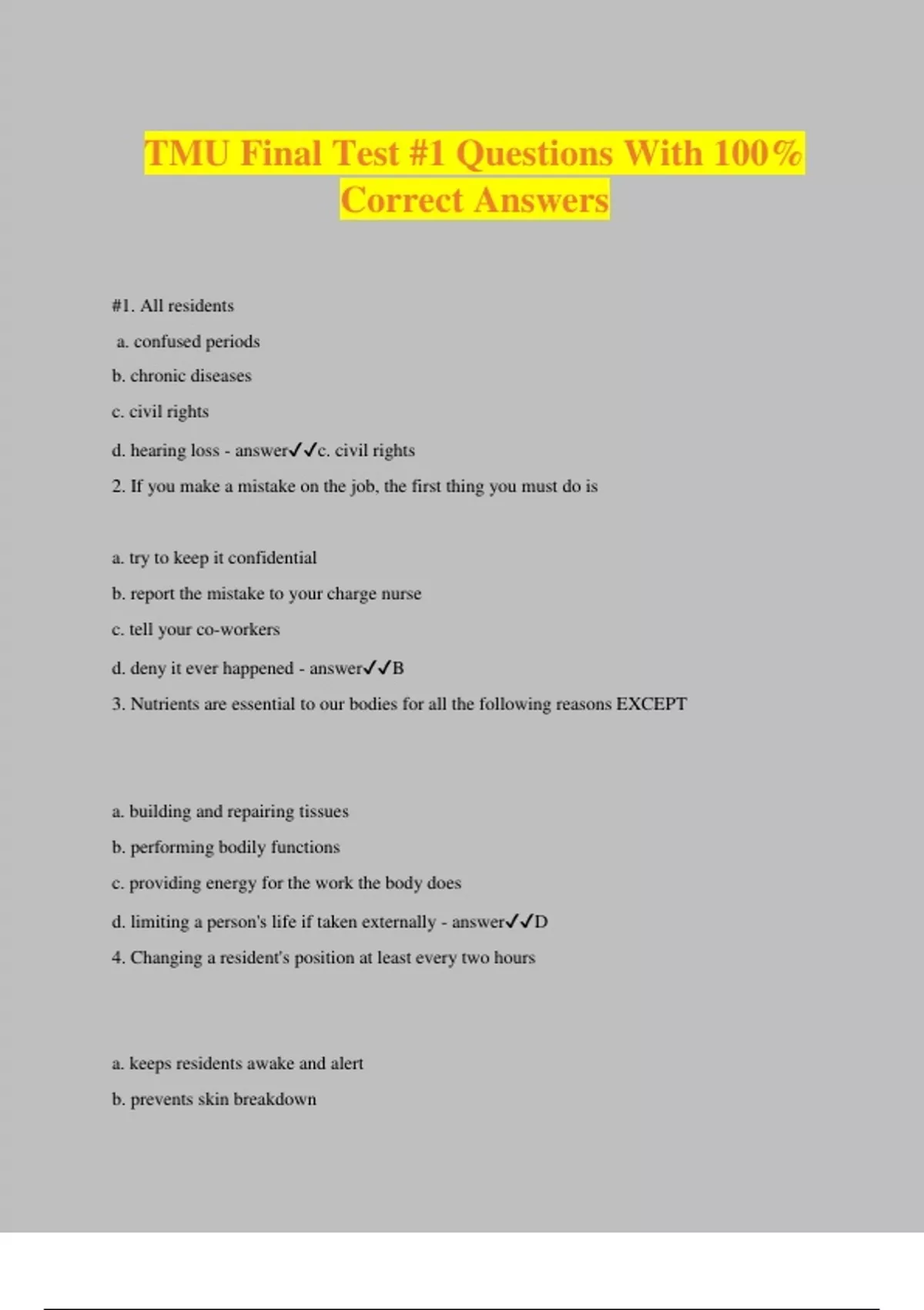TMU Final Test #1 Questions With 100% Correct Answers #1. All residents a. confused periods b. chronic diseases c. civil rights d. hearing loss - answerc. civil rights 2. If you make a mistake on the job, the first thing you must do is a. try to keep it confidential b. report the mistake to your charge nurse c. tell your co-workers d. deny it ever happened - answerB 3. Nutrients are essential to our bodies for all the following reasons EXCEPT a. building and repairing tissues b. performing bodily functions c. providing energy for the work the body does d. limiting a person's life if taken externally - answerD 4. Changing a resident's position at least every two hours a. keeps residents awake and alert b. prevents skin breakdown c. gives nursing assistants good experience d. is not very important for elderly residents - answerB 5. The abbreviation ADL stands for a. alarm door light b. activities of daily living c. additional daily light d. advanced decay line - answerB 6. Which of the following is NOT a mechanical aid used to reduce pressure a. foam pillow or pad b. alternating pressure mattress c. bed cradle d. autoclave - answerD 7. The basic needs of the elderly include a. physical and emotional needs b. the need for a special diet c. a need for assistive devices d. a need for quiet and isolation - answerA 8. A resident with Alzheimer's disease becomes upset and shouts at you. You should a. stand your ground and shout back at them b. answer them in a calm voice c. spend less time with them until they learn that you shouldn't be treated like that d. avoid them whenever you can so as not to agitate them further - answerB 9. Dementia is best defined as a. a lack of blood to a part of the brain b. a state of being happy c. being deprived of reason d. a state of depression - answerC 10. The causes of dementia are not fully known, but some cases of dementia are related to a. diabetes mellitus b. changes in the brain's blood vessels c. arthritis d. cancer - answerB 11. A resident refuses a prescribed tr