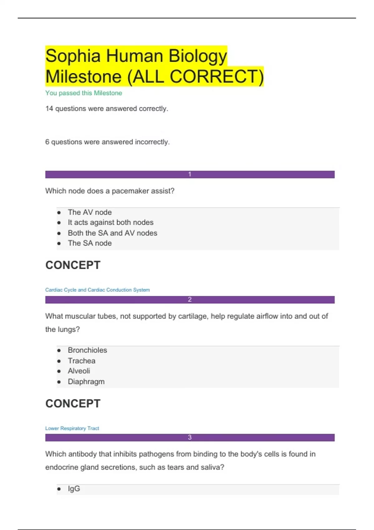 Sophia Human Biology Milestone (ALL CORRECT) You passed this Milestone 14 questions were answered correctly. 6 questions were answered incorrectly. 1 Which node does a pacemaker assist? CONCEPT Cardiac Cycle and Cardiac Conduction System 2 What muscular tubes, not supported by cartilage, help regulate airflow into and out of the lungs? CONCEPT Lower Respiratory Tract 3 Which antibody that inhibits pathogens from binding to the body's cells is found in endocrine gland secretions, such as tears and saliva? CONCEPT Humoral Immunity 4 What is the function of the capillaries? CONCEPT Cardiovascular System 5 Monoclonal antibodies and can be used to treat certain types of cancers in a process known as immunotherapy. CONCEPT Organ Transplant and Immunotherapy 6 What are the two types of effector T-cells? CONCEPT Cell-Mediated Response 7 Which of the following is an autoimmune disorder? CONCEPT Immune System Disorders and HIV/AIDS 8 What kind of immunity involves white blood cells that have receptors for specific pathogens that changes over time and produces memory cells? CONCEPT Pathogens 9 What is the role of the aorta in the systemic circuit?