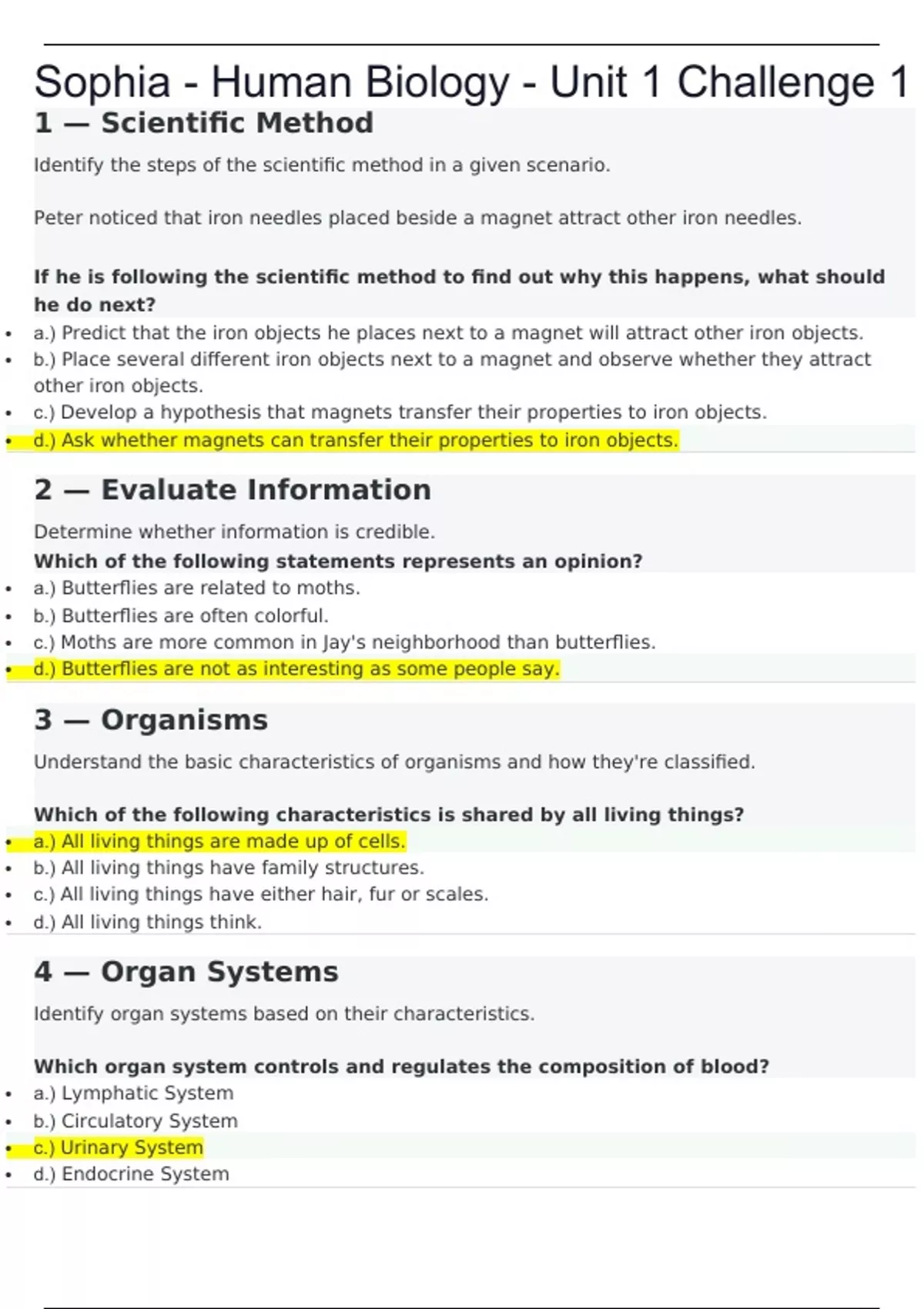1 — Scientific Method Identify the steps of the scientific method in a given scenario. Peter noticed that iron needles placed beside a magnet attract other iron needles. If he is following the scientific method to find out why this happens, what should he do next? • a.) Predict that the iron objects he places next to a magnet will attract other iron objects. • b.) Place several different iron objects next to a magnet and observe whether they attract other iron objects. • c.) Develop a hypothesis that magnets transfer their properties to iron objects. • d.) Ask whether magnets can transfer their properties to iron objects. 2 — Evaluate Information Determine whether information is credible. Which of the following statements represents an opinion? • a.) Butterflies are related to moths. • b.) Butterflies are often colorful. • c.) Moths are more common in Jay's neighborhood than butterflies. • d.) Butterflies are not as interesting as some people say. 3 — Organisms Understand the basic characteristics of organisms and how they're classified. Which of the following characteristics is shared by all living things? • a.) All living things are made up of cells. • b.) All living things have family structures. • c.) All living things have either hair, fur or scales. • d.) All living things think. 4 — Organ Systems Identify organ systems based on their characteristics. Which organ system controls and regulates the composition of blood? • a.) Lymphatic System • b.) Circulatory System • c.) Urinary System • d.) Endocrine System 5 — Homeostasis