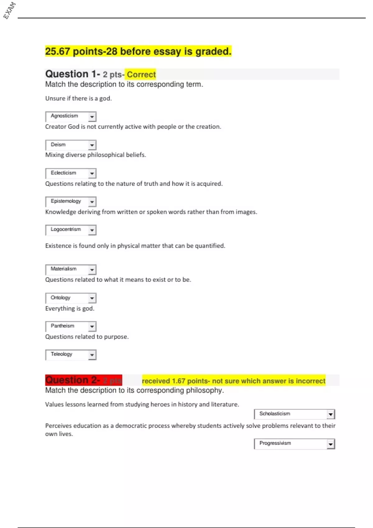 Question 1- 2 pts- Correct Match the description to its corresponding term. Unsure if there is a god. Agnosticism Creator God is not currently active with people or the creation. Deism Mixing diverse philosophical beliefs. Eclecticism Questions relating to the nature of truth and how it is acquired. Epistemology Knowledge deriving from written or spoken words rather than from images. Logocentrism Existence is found only in physical matter that can be quantified. Materialism Questions related to what it means to exist or to be. Ontology Everything is god. Pantheism Questions related to purpose. Teleology Question 2- 2 pts received 1.67 points- not sure which answer is incorrect Match the description to its corresponding philosophy. Values lessons learned from studying heroes in history and literature. Scholasticism Perceives education as a democratic process whereby students actively solve problems relevant to their own lives.