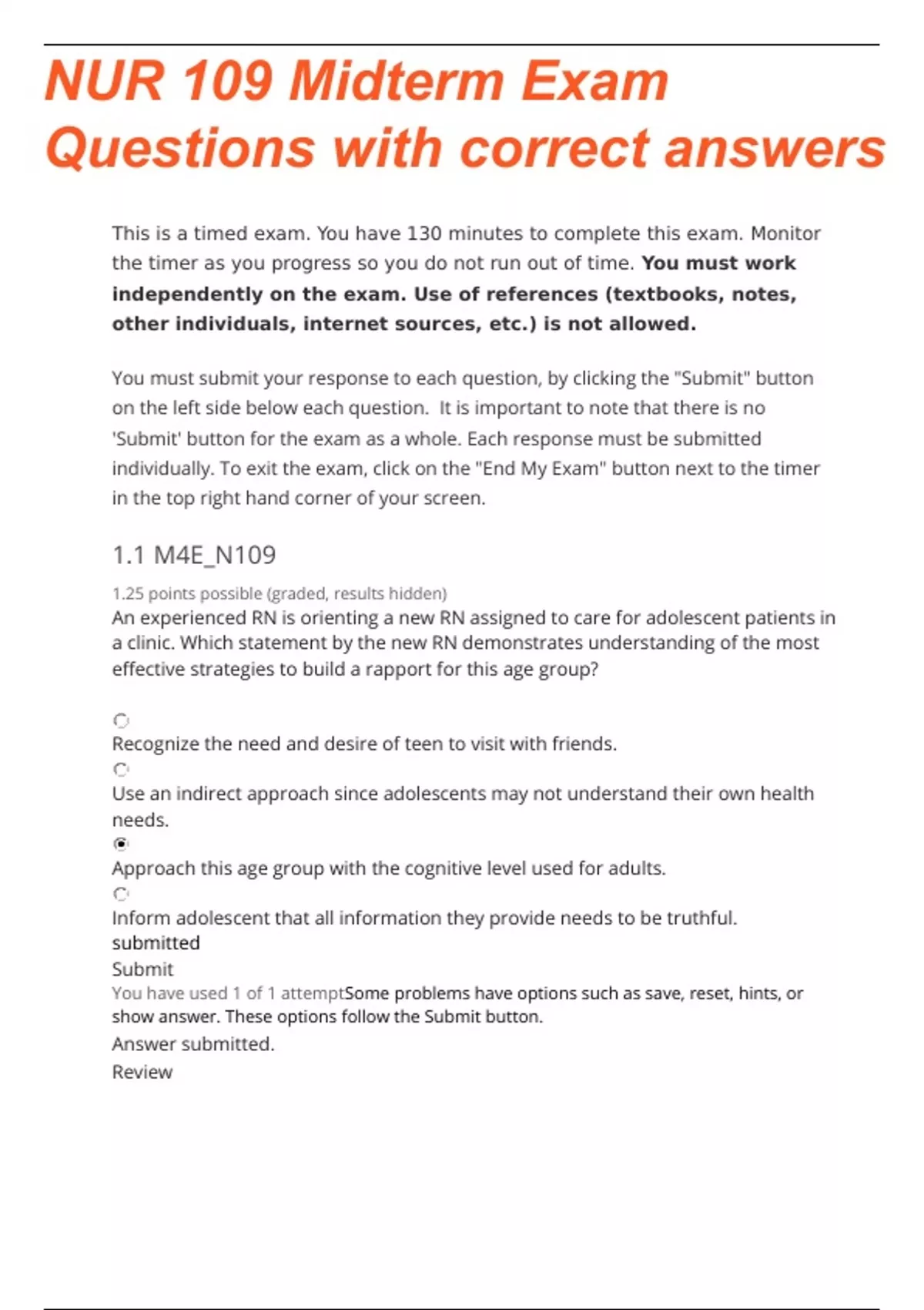 Excelsior College NUR 109 Midterm Exam With Correct Answers