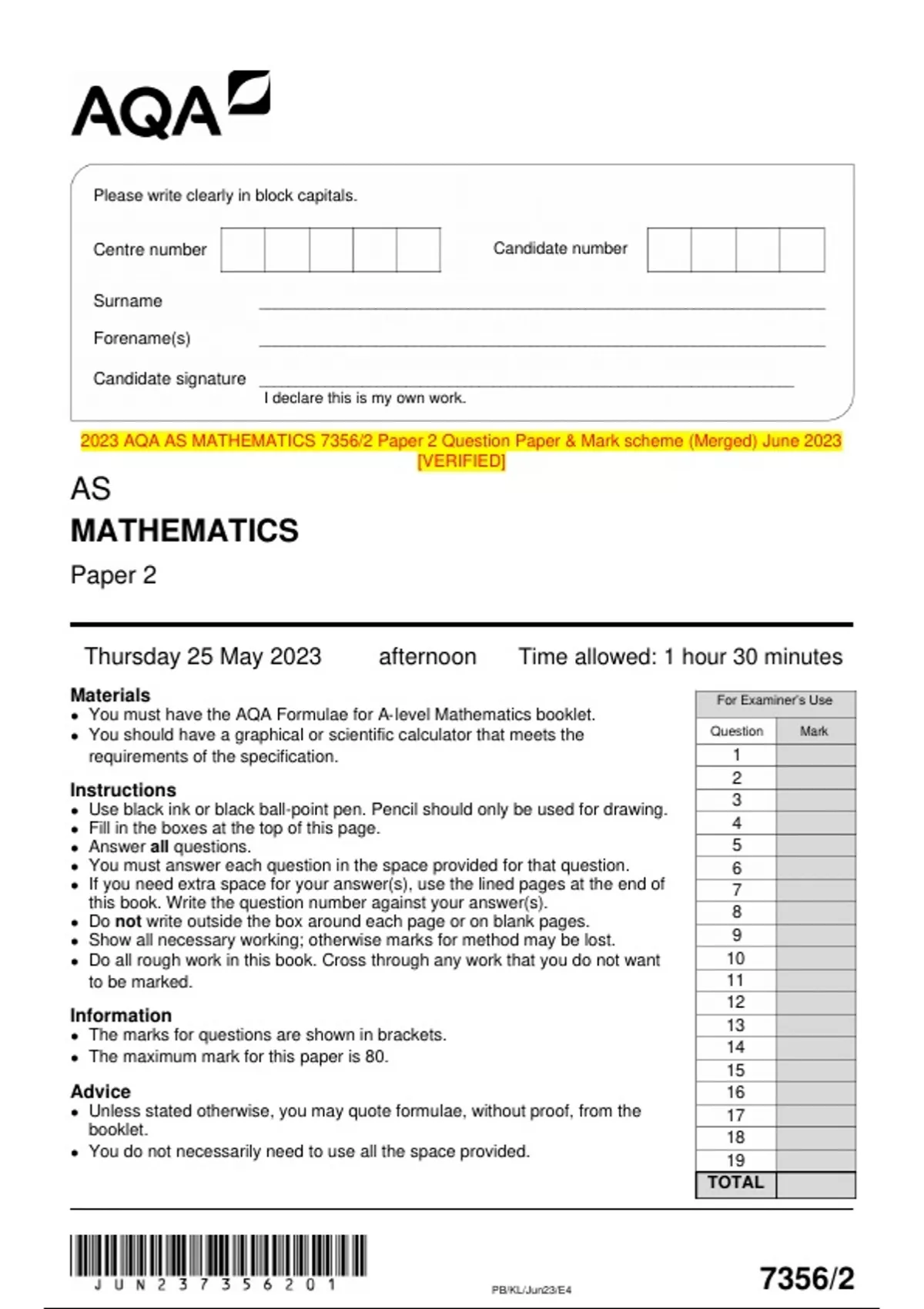 2023 AQA AS MATHEMATICS 7356/2 Paper 2 Question Paper & Mark scheme (Merged) June 2023 [VERIFIED]