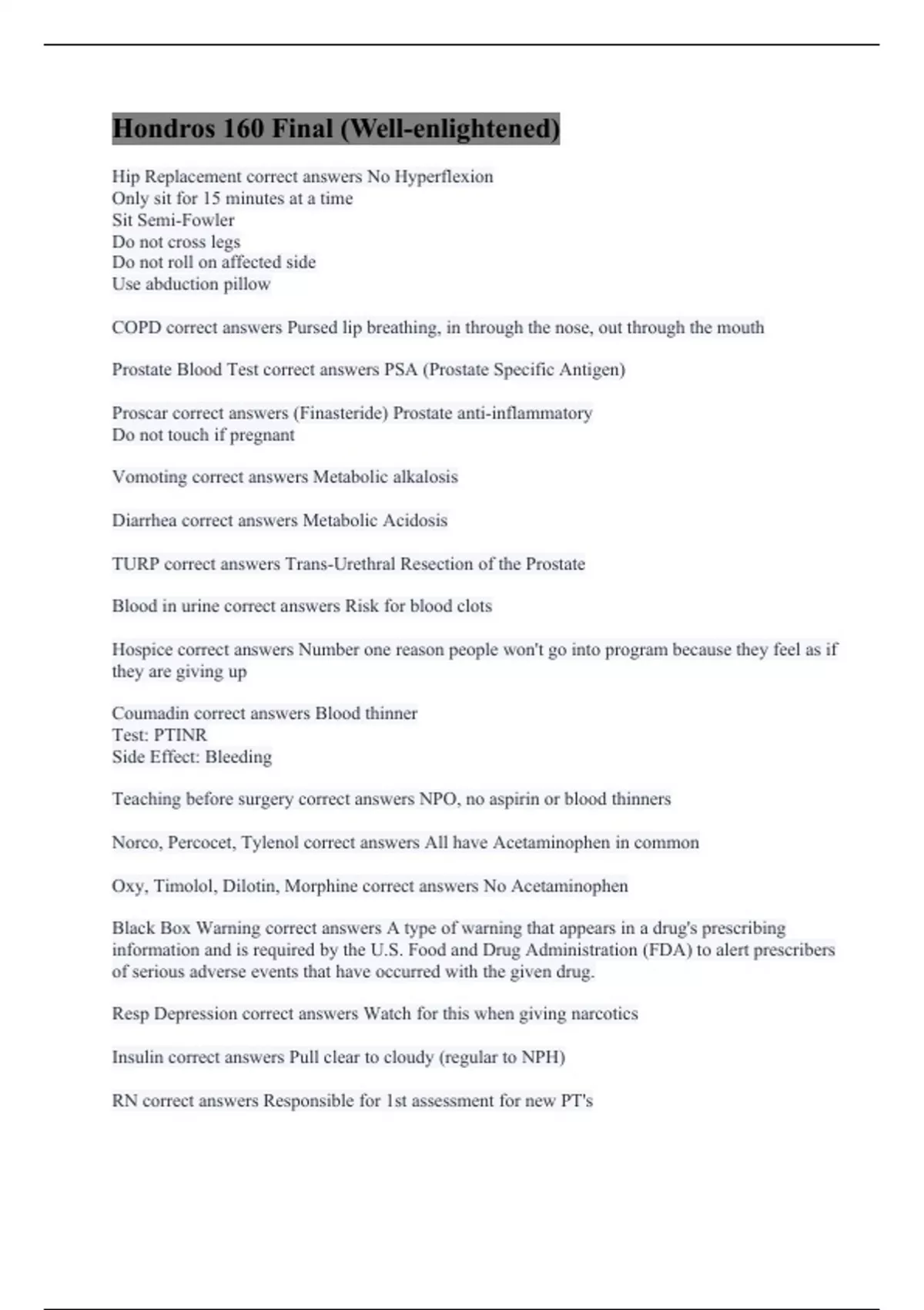 Hip Replacement correct answers No Hyperflexion Only sit for 15 minutes at a time Sit Semi-Fowler Do not cross legs Do not roll on affected side Use abduction pillow COPD correct answers Pursed lip breathing, in through the nose, out through the mouth Prostate Blood Test correct answers PSA (Prostate Specific Antigen) Proscar correct answers (Finasteride) Prostate anti-inflammatory Do not touch if pregnant Vomoting correct answers Metabolic alkalosis Diarrhea correct answers Metabolic Acidosis TURP correct answers Trans-Urethral Resection of the Prostate Blood in urine correct answers Risk for blood clots Hospice correct answers Number one reason people won't go into program because they feel as if they are giving up Coumadin correct answers Blood thinner Test: PTINR Side Effect: Bleeding Teaching before surgery correct answers NPO, no aspirin or blood thinners Norco, Percocet, Tylenol correct answers All have Acetaminophen in common Oxy, Timolol, Dilotin, Morphine correct answers No Acetaminophen Black Box Warning correct answers A type of warning that appears in a drug's prescribing information and is required by the U.S. Food and Drug Administration (FDA) to alert prescribers of serious adverse events that have occurred with the given drug. Resp Depression correct answers Watch for this when giving narcotics Insulin correct answers Pull clear to cloudy (regular to NPH) RN correct answers Responsible for 1st assessment for new PT's