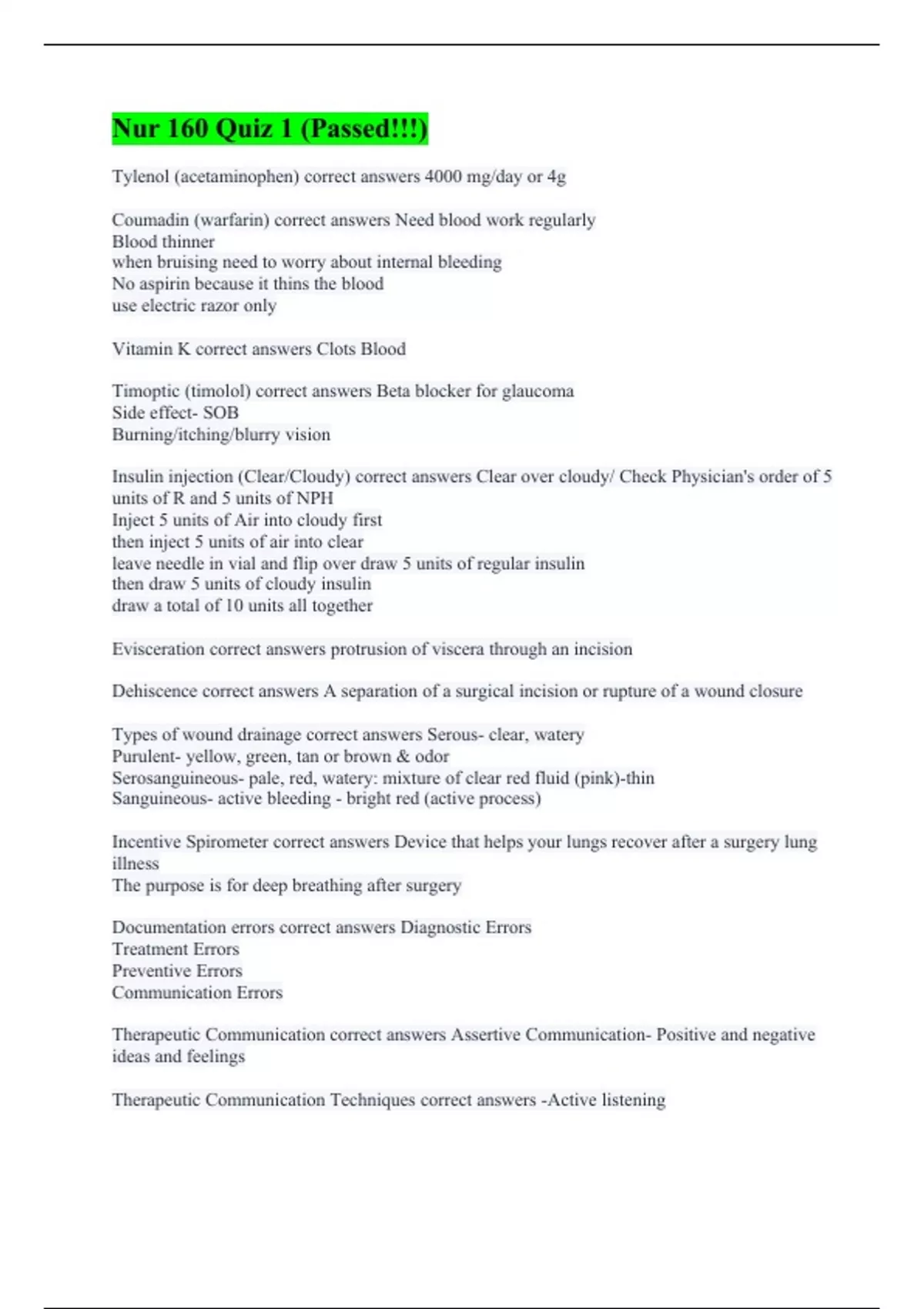 Tylenol (acetaminophen) correct answers 4000 mg/day or 4g Coumadin (warfarin) correct answers Need blood work regularly Blood thinner when bruising need to worry about internal bleeding No aspirin because it thins the blood use electric razor only Vitamin K correct answers Clots Blood Timoptic (timolol) correct answers Beta blocker for glaucoma Side effect- SOB Burning/itching/blurry vision Insulin injection (Clear/Cloudy) correct answers Clear over cloudy/ Check Physician's order of 5 units of R and 5 units of NPH Inject 5 units of Air into cloudy first then inject 5 units of air into clear leave needle in vial and flip over draw 5 units of regular insulin then draw 5 units of cloudy insulin draw a total of 10 units all together Evisceration correct answers protrusion of viscera through an incision Dehiscence correct answers A separation of a surgical incision or rupture of a wound closure Types of wound drainage correct answers Serous- clear, watery Purulent- yellow, green, tan or brown & odor Serosanguineous- pale, red, watery: mixture of clear red fluid (pink)-thin Sanguineous- active bleeding - bright red (active process) Incentive Spirometer correct answers Device that helps your lungs recover after a surgery lung illness The purpose is for deep breathing after surgery Documentation errors correct answers Diagnostic Errors Treatment Errors Preventive Errors Communication Errors Therapeutic Communication correct answers Assertive Communication- Positive and negative ideas and feelings Therapeutic Communication Techniques correct answers -Active listening