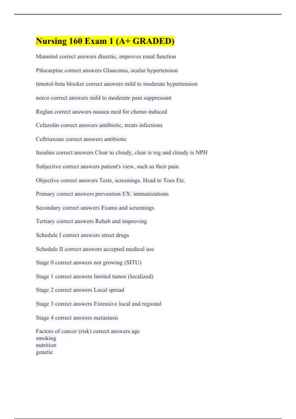 Mannitol correct answers diuretic, improves renal function Pilocarpine correct answers Glaucoma, ocular hypertension timotol-beta blocker correct answers mild to moderate hypertension norco correct answers mild to moderate pain suppressant Reglan correct answers nausea med for chemo induced Cefazolin correct answers antibiotic, treats infections Ceftriaxone correct answers antibiotic Insulins correct answers Clear to cloudy, clear is reg and cloudy is NPH Subjective correct answers patient's view, such as their pain. Objective correct answers Tests, screenings. Head to Toes Etc. Primary correct answers prevention EX: immunizations Secondary correct answers Exams and screenings Tertiary correct answers Rehab and improving Schedule I correct answers street drugs Schedule II correct answers accepted medical use Stage 0 correct answers not growing (SITU) Stage 1 correct answers limited tumor (localized) Stage 2 correct answers Local spread Stage 3 correct answers Extensive local and regional Stage 4 correct answers metastasis Factors of cancer (risk) correct answers age smoking nutrition genetic
