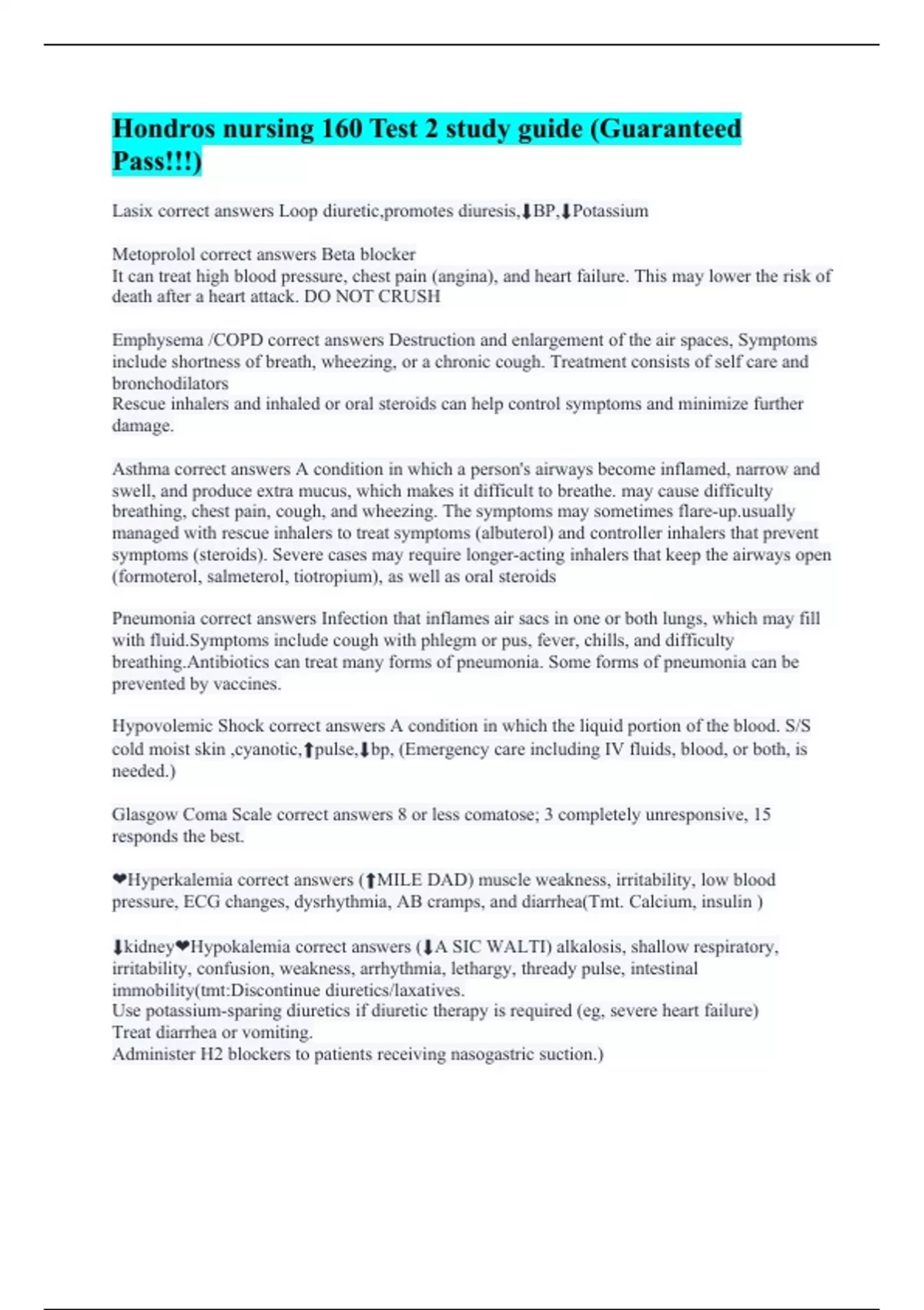 Lasix correct answers Loop diuretic,promotes diuresis,⬇BP,⬇Potassium Metoprolol correct answers Beta blocker It can treat high blood pressure, chest pain (angina), and heart failure. This may lower the risk of death after a heart attack. DO NOT CRUSH Emphysema /COPD correct answers Destruction and enlargement of the air spaces, Symptoms include shortness of breath, wheezing, or a chronic cough. Treatment consists of self care and bronchodilators Rescue inhalers and inhaled or oral steroids can help control symptoms and minimize further damage. Asthma correct answers A condition in which a person's airways become inflamed, narrow and swell, and produce extra mucus, which makes it difficult to breathe. may cause difficulty breathing, chest pain, cough, and wheezing. The symptoms may sometimes ly managed with rescue inhalers to treat symptoms (albuterol) and controller inhalers that prevent symptoms (steroids). Severe cases may require longer-acting inhalers that keep the airways open (formoterol, salmeterol, tiotropium), as well as oral steroids Pneumonia correct answers Infection that inflames air sacs in one or both lungs, which may fill with fluid.Symptoms include cough with phlegm or pus, fever, chills, and difficulty breathing.Antibiotics can treat many forms of pneumonia. Some forms of pneumonia can be prevented by vaccines. Hypovolemic Shock correct answers A condition in which the liquid portion of the blood. S/S cold moist skin ,cyanotic,⬆pulse,⬇bp, (Emergency care including IV fluids, blood, or both, is needed.) Glasgow Coma Scale correct answers 8 or less comatose; 3 completely unresponsive, 15 responds the best. Hyperkalemia correct answers (⬆MILE DAD) muscle weakness, irritability, low blood pressure, ECG changes, dysrhythmia, AB cramps, and diarrhea(Tmt. Calcium, insulin ) ⬇kidneyHypokalemia correct answers (⬇A SIC WALTI) alkalosis, shallow respiratory, irritability, confusion, weakness, arrhythmia, lethargy, thready pulse, intestinal immobility(tmt:Discontinue diuretics/laxatives. Use potassium-sparing diuretics if diuretic therapy is required (eg, severe heart failure) Treat diarrhea or vomiting. Administer H2 blockers to patients receiving nasogastric suction.)