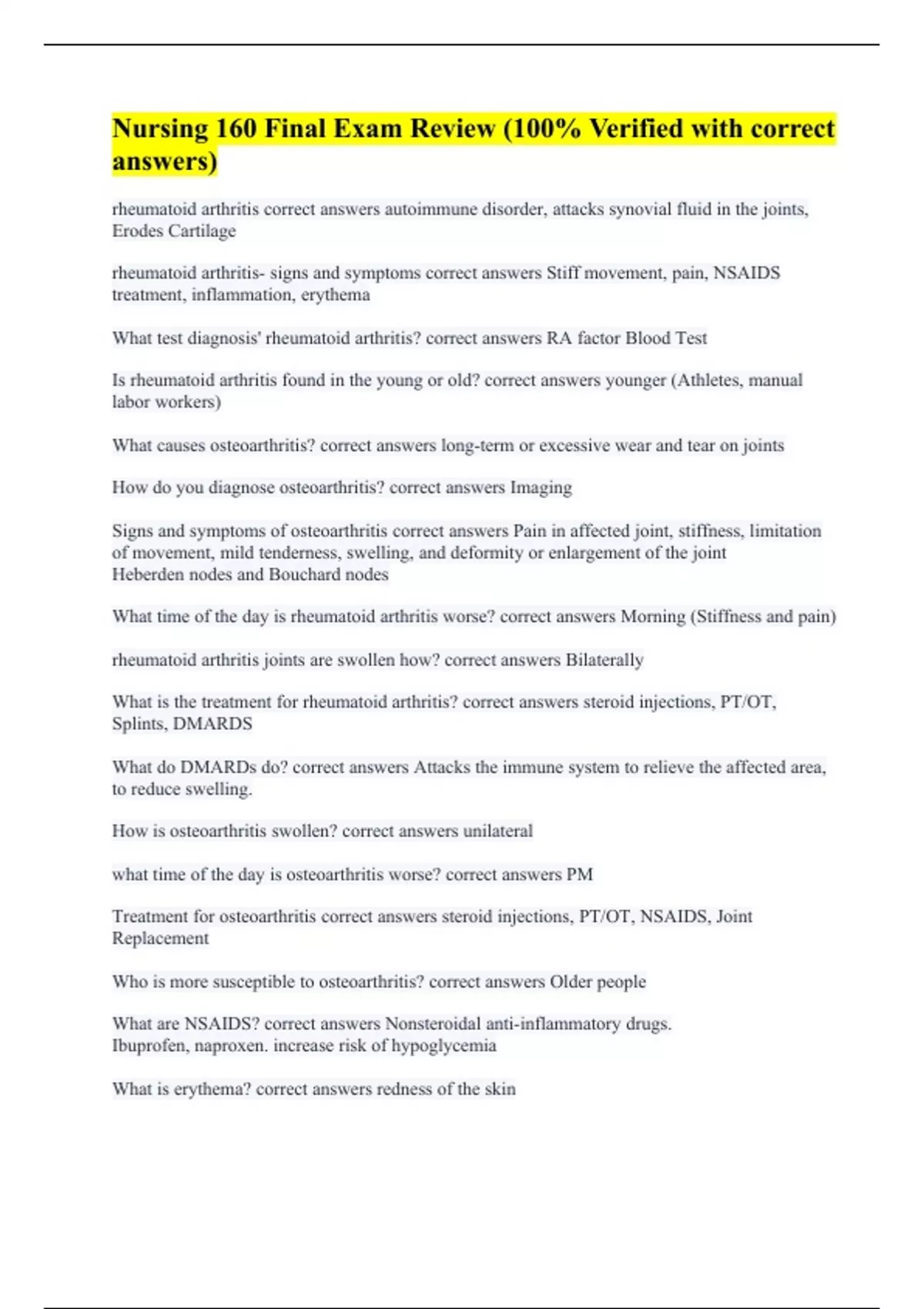 rheumatoid arthritis correct answers autoimmune disorder, attacks synovial fluid in the joints, Erodes Cartilage rheumatoid arthritis- signs and symptoms correct answers Stiff movement, pain, NSAIDS treatment, inflammation, erythema What test diagnosis' rheumatoid arthritis? correct answers RA factor Blood Test Is rheumatoid arthritis found in the young or old? correct answers younger (Athletes, manual labor workers) What causes osteoarthritis? correct answers long-term or excessive wear and tear on joints How do you diagnose osteoarthritis? correct answers Imaging Signs and symptoms of osteoarthritis correct answers Pain in affected joint, stiffness, limitation of movement, mild tenderness, swelling, and deformity or enlargement of the joint Heberden nodes and Bouchard nodes What time of the day is rheumatoid arthritis worse? correct answers Morning (Stiffness and pain) rheumatoid arthritis joints are swollen how? correct answers Bilaterally What is the treatment for rheumatoid arthritis? correct answers steroid injections, PT/OT, Splints, DMARDS What do DMARDs do? correct answers Attacks the immune system to relieve the affected area, to reduce swelling. How is osteoarthritis swollen? correct answers unilateral what time of the day is osteoarthritis worse? correct answers PM Treatment for osteoarthritis correct answers steroid injections, PT/OT, NSAIDS, Joint Replacement Who is more susceptible to osteoarthritis? correct answers Older people What are NSAIDS? correct answers Nonsteroidal anti-inflammatory drugs. Ibuprofen, naproxen. increase risk of hypoglycemia What is erythema? correct answers redness of the skin