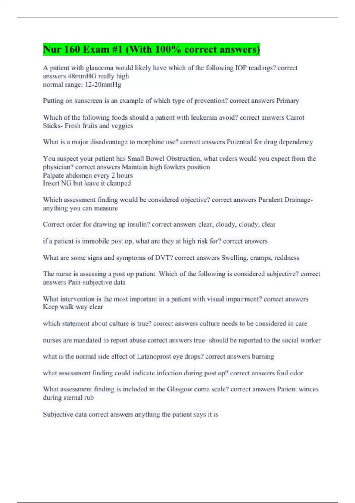 A patient with glaucoma would likely have which of the following IOP readings? correct answers 48mmHG really high normal range: 12-20mmHg Putting on sunscreen is an example of which type of prevention? correct answers Primary Which of the following foods should a patient with leukemia avoid? correct answers Carrot Sticks- Fresh fruits and veggies What is a major disadvantage to morphine use? correct answers Potential for drug dependency You suspect your patient has Small Bowel Obstruction, what orders would you expect from the physician? correct answers Maintain high fowlers position Palpate abdomen every 2 hours Insert NG but leave it clamped Which assessment finding would be considered objective? correct answers Purulent Drainage- anything you can measure Correct order for drawing up insulin? correct answers clear, cloudy, cloudy, clear if a patient is immobile post op, what are they at high risk for? correct answers What are some signs and symptoms of DVT? correct answers Swelling, cramps, reddness The nurse is assessing a post op patient. Which of the following is considered subjective? correct answers Pain-subjective data What intervention is the most important in a patient with visual impairment? correct answers Keep walk way clear which statement about culture is true? correct answers culture needs to be considered in care nurses are mandated to report abuse correct answers true- should be reported to the social worker what is the normal side effect of Latanoprost eye drops? correct answers burning what assessment finding could indicate infection during post op? correct answers foul odor What assessment finding is included in the Glasgow coma scale? correct answers Patient winces during sternal rub Subjective data correct answers anything the patient says it is