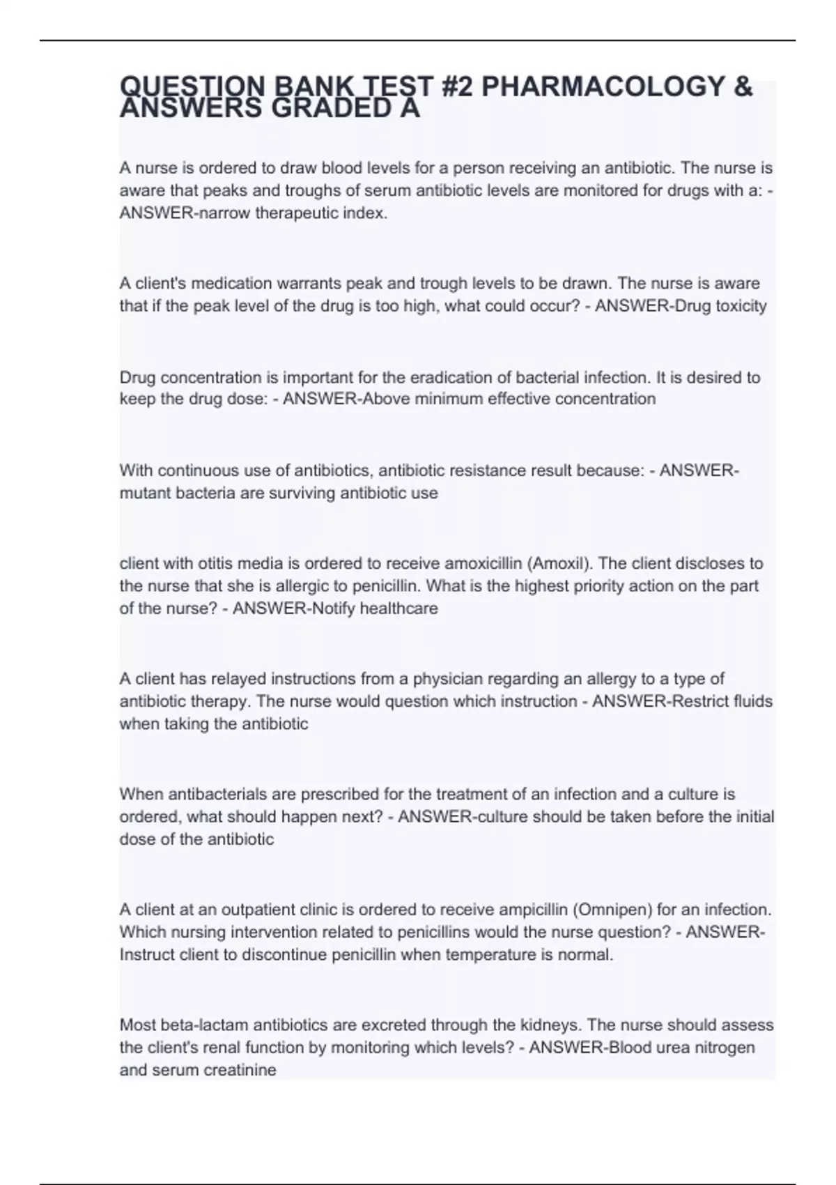 A nurse is ordered to draw blood levels for a person receiving an antibiotic. The nurse is aware that peaks and troughs of serum antibiotic levels are monitored for drugs with a: - ANSWER-narrow therapeutic index. A client's medication warrants peak and trough levels to be drawn. The nurse is aware that if the peak level of the drug is too high, what could occur? - ANSWER-Drug toxicity Drug concentration is important for the eradication of bacterial infection. It is desired to keep the drug dose: - ANSWER-Above minimum effective concentration With continuous use of antibiotics, antibiotic resistance result because: - ANSWER-mutant bacteria are surviving antibiotic use client with otitis media is ordered to receive amoxicillin (Amoxil). The client discloses to the nurse that she is allergic to penicillin. What is the highest priority action on the part of the nurse? - ANSWER-Notify healthcare A client has relayed instructions from a physician regarding an allergy to a type of antibiotic therapy. The nurse would question which instruction - ANSWER-Restrict fluids when taking the antibiotic When antibacterials are prescribed for the treatment of an infection and a culture is ordered, what should happen next? - ANSWER-culture should be taken before the initial dose of the antibiotic A client at an outpatient clinic is ordered to receive ampicillin (Omnipen) for an infection. Which nursing intervention related to penicillins would the nurse question? - ANSWER-Instruct client to discontinue penicillin when temperature is normal.