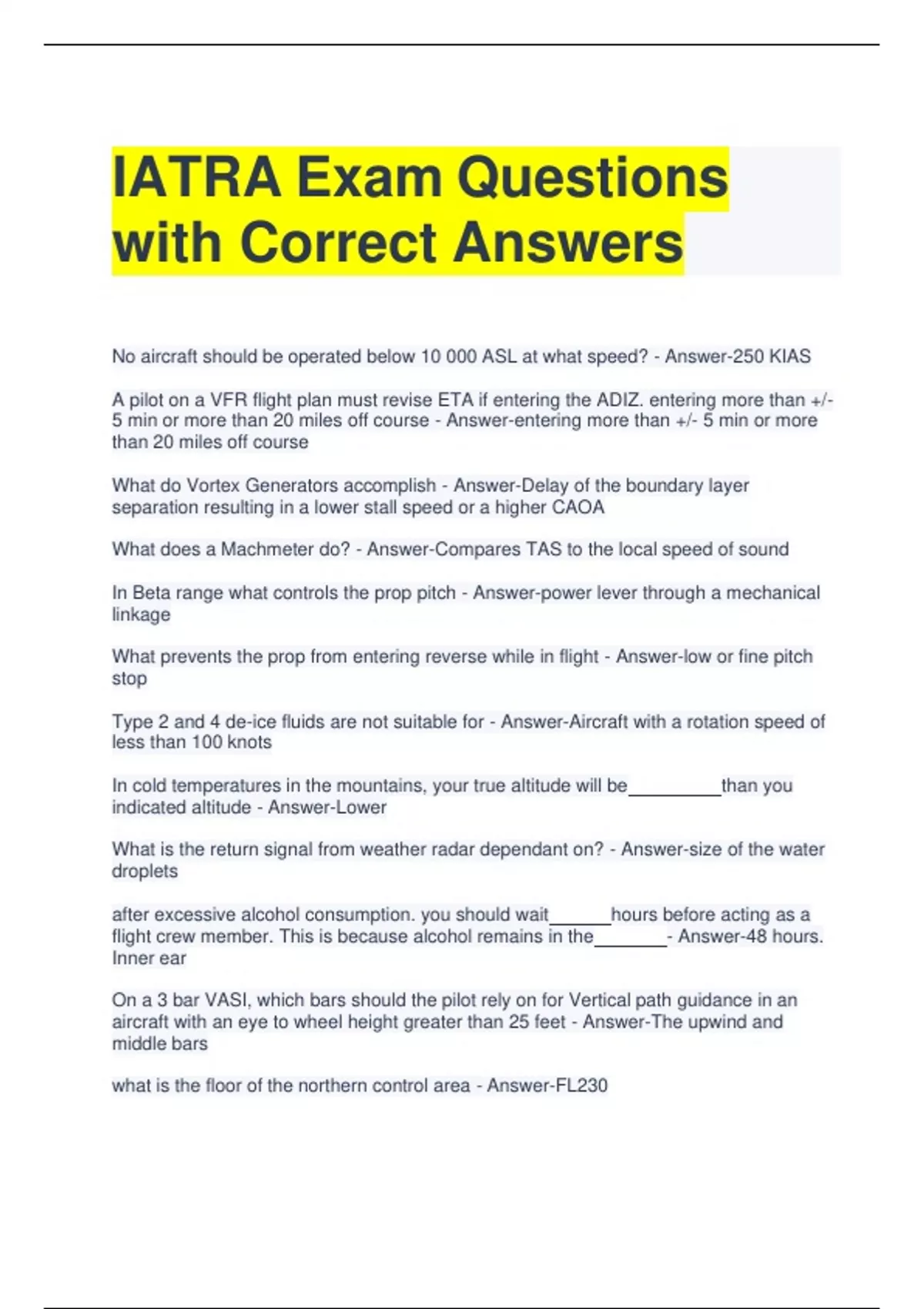 IATRA Exam Questions with Correct Answers No aircraft should be operated below 10 000 ASL at what speed? - Answer-250 KIAS A pilot on a VFR flight plan must revise ETA if entering the ADIZ. entering more than +/- 5 min or more than 20 miles off course - Answer-entering more than +/- 5 min or more than 20 miles off course What do Vortex Generators accomplish - Answer-Delay of the boundary layer separation resulting in a lower stall speed or a higher CAOA What does a Machmeter do? - Answer-Compares TAS to the local speed of sound In Beta range what controls the prop pitch - Answer-power lever through a mechanical linkage What prevents the prop from entering reverse while in flight - Answer-low or fine pitch stop Type 2 and 4 de-ice fluids are not suitable for - Answer-Aircraft with a rotation speed of less than 100 knots In cold temperatures in the mountains, your true altitude will be than you indicated altitude - Answer-Lower What is the return signal from weather radar dependant on? - Answer-size of the water droplets after excessive alcohol consumption. you should wait hours before acting as a flight crew member. This is because alcohol remains in the - Answer-48 hours. Inner ear On a 3 bar VASI, which bars should the pilot rely on for Vertical path guidance in an aircraft with an eye to wheel height greater than 25 feet - Answer-The upwind and middle bars