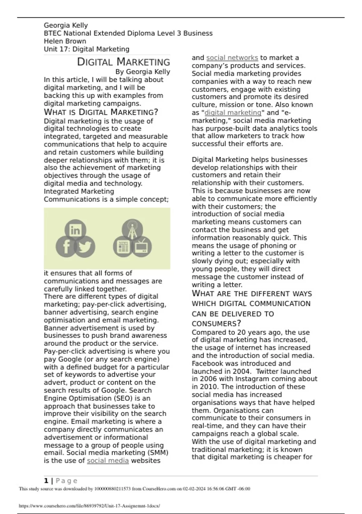 DIGITAL MARKETING By Georgia Kelly In this article, I will be talking about digital marketing, and I will be backing this up with examples from digital marketing campaigns. WHAT IS DIGITAL MARKETING? Digital marketing is the usage of digital technologies to create integrated, targeted and measurable communications that help to acquire and retain customers while building deeper relationships with them; it is also the achievement of marketing objectives through the usage of digital media and technology. Integrated Marketing Communications is a simple concept;