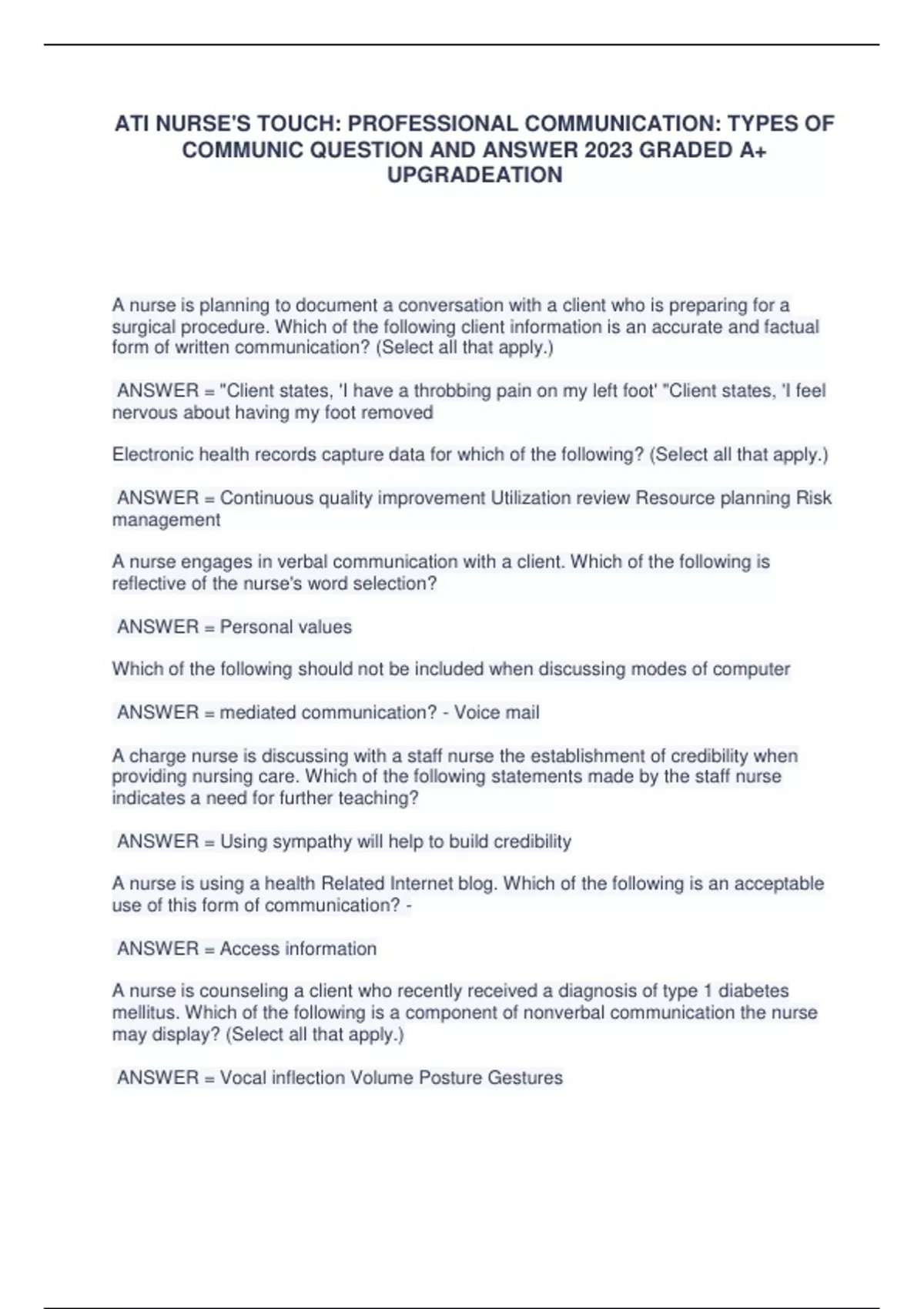 ATI NURSE'S TOUCH: PROFESSIONAL COMMUNICATION: TYPES OF COMMUNIC QUESTION AND ANSWER 2023 GRADED A+ UPGRADEATION