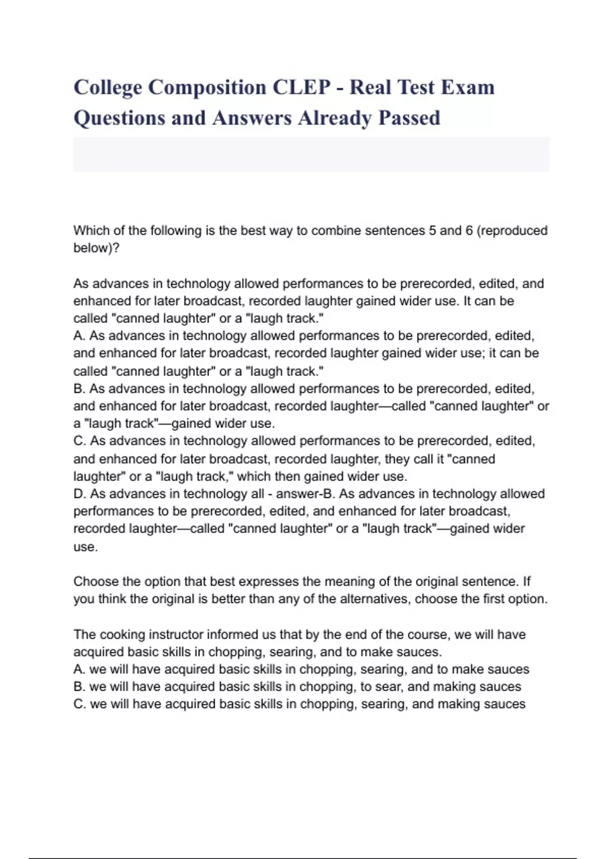 College Composition CLEP - Real Test Exam Questions and Answers Already Passed