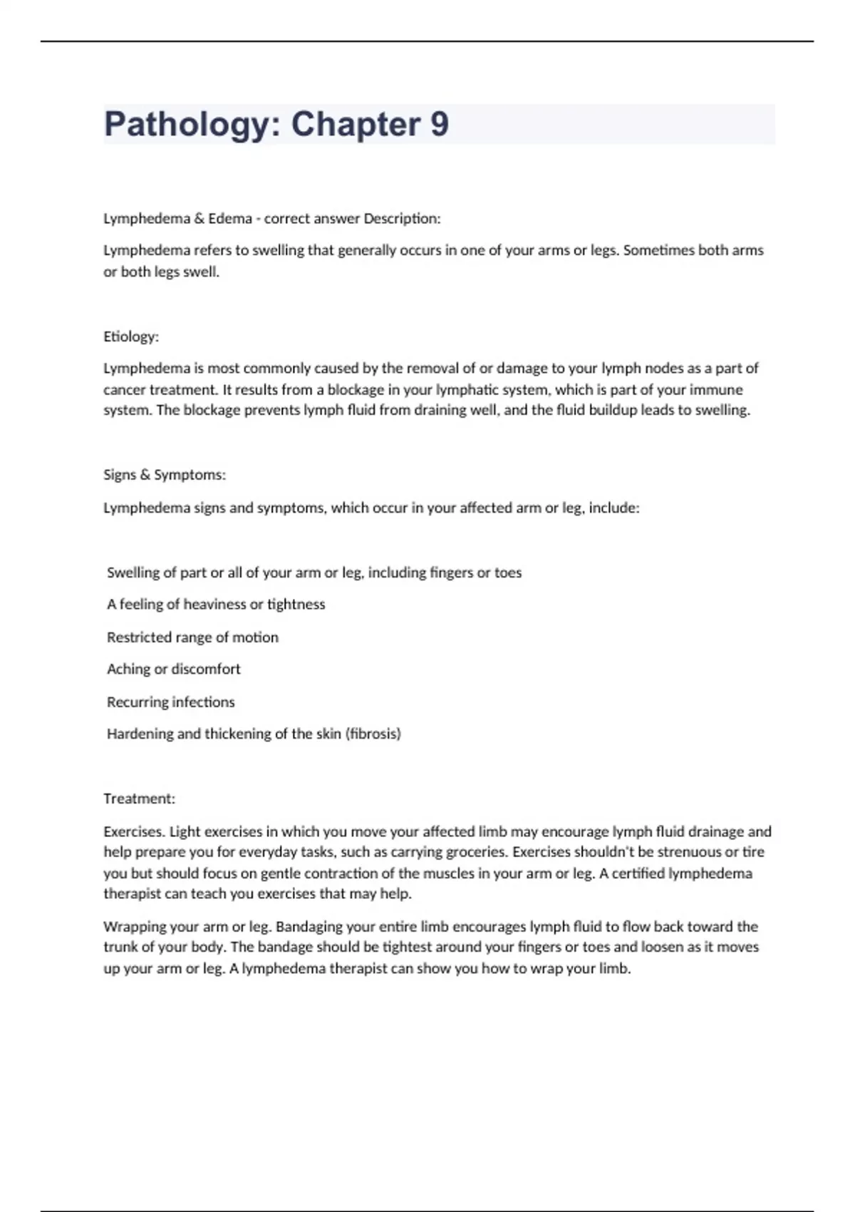 Pathology Chapter 9 Question and answers rated A+ 2023/2024Lymphedema & Edema - correct answer Description: Lymphedema refers to swelling that generally occurs in one of your arms or legs. Sometimes both arms or both legs swell. Etiology: Lymphedema is most commonly caused by the removal of or damage to your lymph nodes as a part of cancer treatment. It results from a blockage in your lymphatic system, which is part of your immune system. The blockage prevents lymph fluid from draining well, and the fluid buildup leads to swelling. Signs & Symptoms: Lymphedema signs and symptoms, which occur in your affected arm or leg, include: