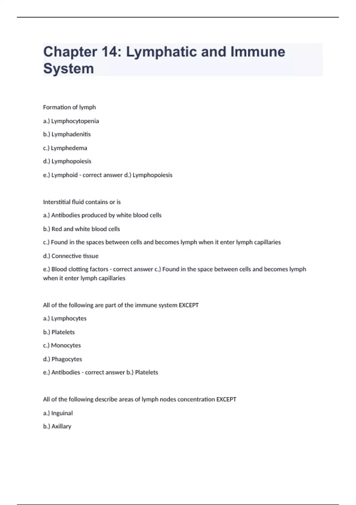 Chapter 14 Lymphatic and Immune System Question and answers 2023/2024 verified to pass Formation of lymph a.) Lymphocytopenia b.) Lymphadenitis c.) Lymphedema d.) Lymphopoiesis e.) Lymphoid - correct answer d.) Lymphopoiesis Interstitial fluid contains or is a.) Antibodies produced by white blood cells b.) Red and white blood cells c.) Found in the spaces between cells and becomes lymph when it enter lymph capillaries d.) Connective tissue e.) Blood clotting factors - correct answer c.) Found in the space between cells and becomes lymph when it enter lymph capillaries All of the following are part of the immune system EXCEPT a.) Lymphocytes b.) Platelets c.) Monocytes d.) Phagocytes e.) Antibodies - correct answer b.) Platelets All of the following describe are