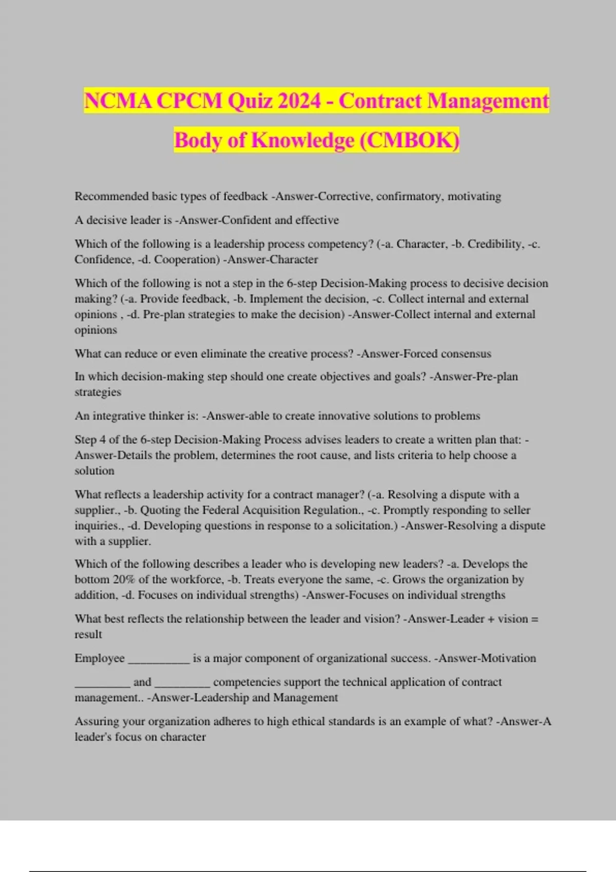 NCMA CPCM Quiz 2024 - Contract Management Body of Knowledge (CMBOK) Recommended basic types of feedback -Answer-Corrective, confirmatory, motivating A decisive leader is -Answer-Confident and effective Which of the following is a leadership process competency? (-a. Character, -b. Credibility, -c. Confidence, -d. Cooperation) -Answer-Character Which of the following is not a step in the 6-step Decision-Making process to decisive decision making? (-a. Provide feedback, -b. Implement the decision, -c. Collect internal and external opinions , -d. Pre-plan strategies to make the decision) -Answer-Collect internal and external opinions What can reduce or even eliminate the creative process? -Answer-Forced consensus In which decision-making step should one create objectives and goals? -Answer-Pre-plan strategies An integrative thinker is: -Answer-able to create innovative solutions to problems Step 4 of the 6-step Decision-Making Process advises leaders to create a written plan that: - Answer-Details the problem, determines the root cause, and lists criteria to help choose a solution What reflects a leadership activity for a contract manager? (-a. Resolving a dispute with a supplier., -b. Quoting the Federal Acquisition Regulation., -c. Promptly responding to seller inquiries., -d. Developing questions in response to a solicitation.) -Answer-Resolving a dispute with a supplier. Which of the following describes a leader who is developing new leaders? -a. Develops the bottom 20% of the workforce, -b. Treats everyone the same, -c. Grows the organization by addition, -d. Focuses on individual strengths) -Answer-Focuses on individual strengths What best reflects the relationship between the leader and vision? -Answer-Leader + vision = result Employee __________ is a major component of organizational success. -Answer-Motivation _________ and _________ competencies support the technical application of contract management.. -Answer-Leadership and Management Assuring your organization adheres to high ethical standards is an example of what? -Answer-A leader's focus on character Which of the following can impede leaders from developing a vision? (Failing to consult others, Focusing on the day-to-day, Being inflexible, Living in the past) -Answer-Living in the past When a leader in your organization insists that you accomplish something that you believe is unethical, it likely reflects what? -Answer-Abuse of power Why would contract managers need vision? -Answer-To drive behaviors that achieve the mission Optimism is an important leadership tool, but it can be undermined by: -Answer-Inflexibility You've read FAR 33.103 (Agency Protests) over and over and are still unable to determine if you can go ahead and award the contract. This could be an example of _______________, and your next step could be _______________. -Answer-Insufficient information; consult with stakeholders Character is composed of which three elements? -Answer-Integrity, optimism, decisiveness When pre-planning strategies for making a decision, the leader should: -Answer-Dispel assumptions that can negatively affect his/her leadership role Which of the following is a principle required for an organizational culture of high ethical standards? (-a. Documenting all decisions, -b. Providing rationale for all decisions, -c. Including others in decisions, -d. Leading by example) -Answer-Leading by example When your supervisor fails to delegate tasks to you, preferring to do it themselves, what is this called? -Answer-Resisting force to achieving competence Successful contract management depends on the leader's ability to integrate: -Answer-The leadership process competencies If you are an experienced contract management leader and you need to make a fast, high risk decision in an uncertain situation, what is the best approach? -Answer-Intuition Risk management is: -Answer-The ability to efficiently and cost-effectively mitigate problems When tracking costs following the award of a contract, what is latency? -Answer-The delay between when a cost is incurred and when it appears in the accounting system. This costing method uses a two-step process: 1 - assign the resource costs of each activity, and 2 - assign activity costs to the output: -Answer-Activity-Based Costing System. The process for creating the Resource-Loaded Schedule begins with: -Answer-...extracting a Work Breakdown Structure from the Statement of Work. When suppliers are being certified or pre-qualified they have been: -Answer-Screened Regardless of an organization's contracting activity size and purpose, the following four key functions of management are essential: -Answer-Planning, Organizing, Directing, Controlling Analysis to measure the company's ability to meet current and long-term obligations would use the following ratio: -Answer-Solvency Ratio. Providing information to satisfy Federal contract reporting requires the comparison of current accounting data and a time-phased program budget. One standard approach is the use of: - Answer-An "S" Curve that represents how activities ramp up and tail off during a project. Supply Chain Management: -Answer-Involves managing the activities to produce and deliver a product or service from suppliers to the end user customer A contracting officer is preparing to award a contract for Advisory & Assistance Services to a small business. The contracting officer wants to make sure the small business is financially capable of performing and managing the contract. The Contracting Officer requests the contractors Balance Sheet from the most recently completed fiscal year. What is an example of another item the Contracting Officer might consider requesting to make a more informed decision? -Answer-Cash flow statement Burn Rate funding analysis "spreads" the contract value over time in a level-loading scheme. This technique: -Answer-fails to consider project phases, or the potential for programs to "ramp- up" activity at the beginning, and "tai