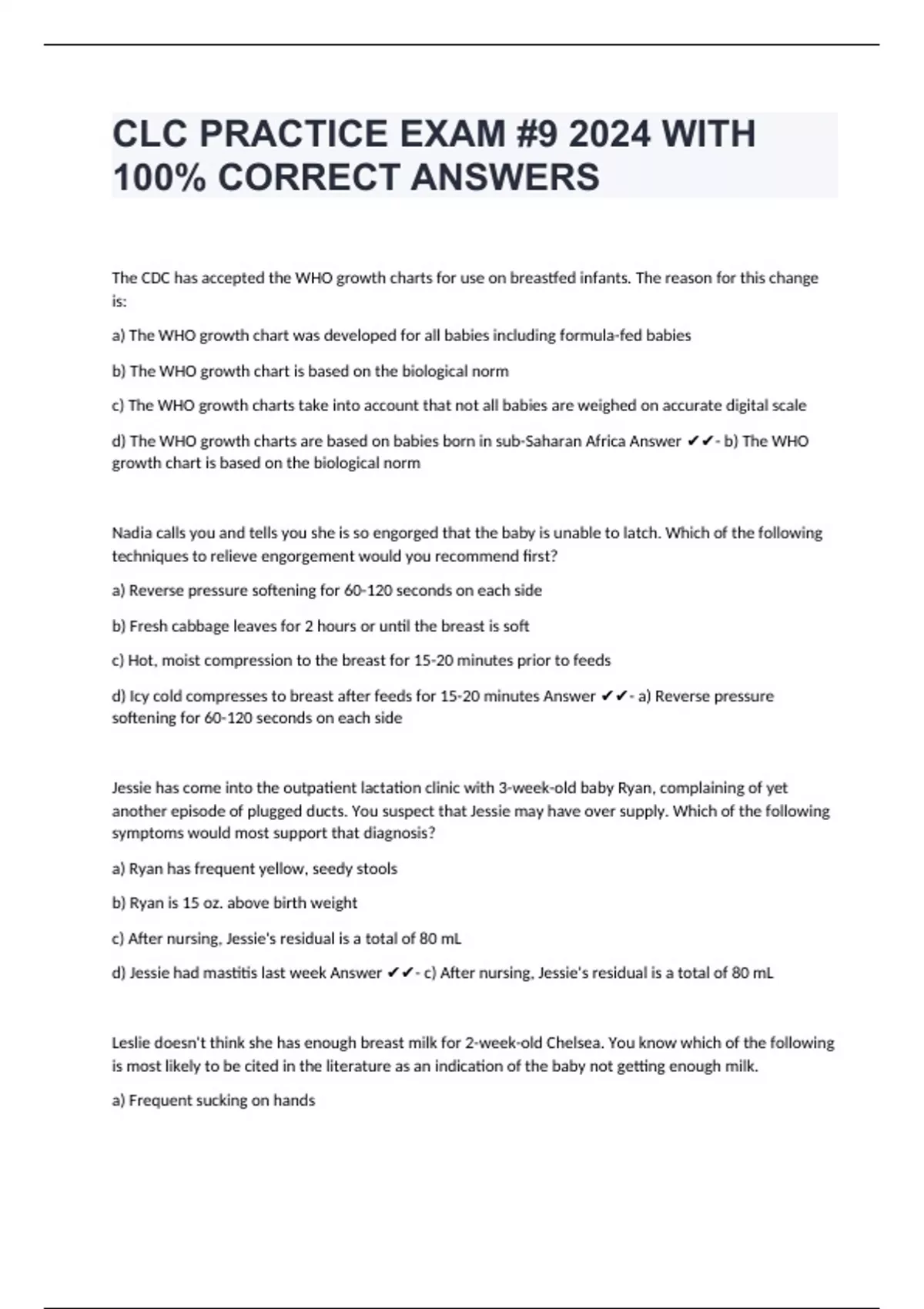 The CDC has accepted the WHO growth charts for use on breastfed infants. The reason for this change is: a) The WHO growth chart was developed for all babies including formula-fed babies b) The WHO growth chart is based on the biological norm c) The WHO growth charts take into account that not all babies are weighed on accurate digital scale d) The WHO growth charts are based on babies born in sub-Saharan Africa Answer - b) The WHO growth chart is based on the biological norm Nadia calls you and tells you she is so engorged that the baby is unable to latch. Which of the following techniques to relieve engorgement would you recommend first? a) Reverse pressure softening for 60-120 seconds on each side b) Fresh cabbage leaves for 2 hours or until the breast is soft c) Hot, moist compression to the breast for 15-20 minutes prior to feeds d) Icy cold compresses to breast after feeds for 15-20 minutes Answer - a) Reverse pressure softening for 60-120 seconds on each side Jessie has come into the outpatient lactation clinic with 3-week-old baby Ryan, complaining of yet another episode of plugged ducts. You suspect that Jessie may have over supply. Which of the following symptoms would most support that diagnosis? a) Ryan has frequent yellow, seedy stools b) Ryan is 15 oz. above birth weight c) After nursing, Jessie's residual is a total of 80 mL d) Jessie had mastitis last week Answer - c) After nursing, Jessie's residual is a total of 80 mL Leslie doesn't think she has enough breast milk for 2-week-old Chelsea. You know which of the following is most likely t