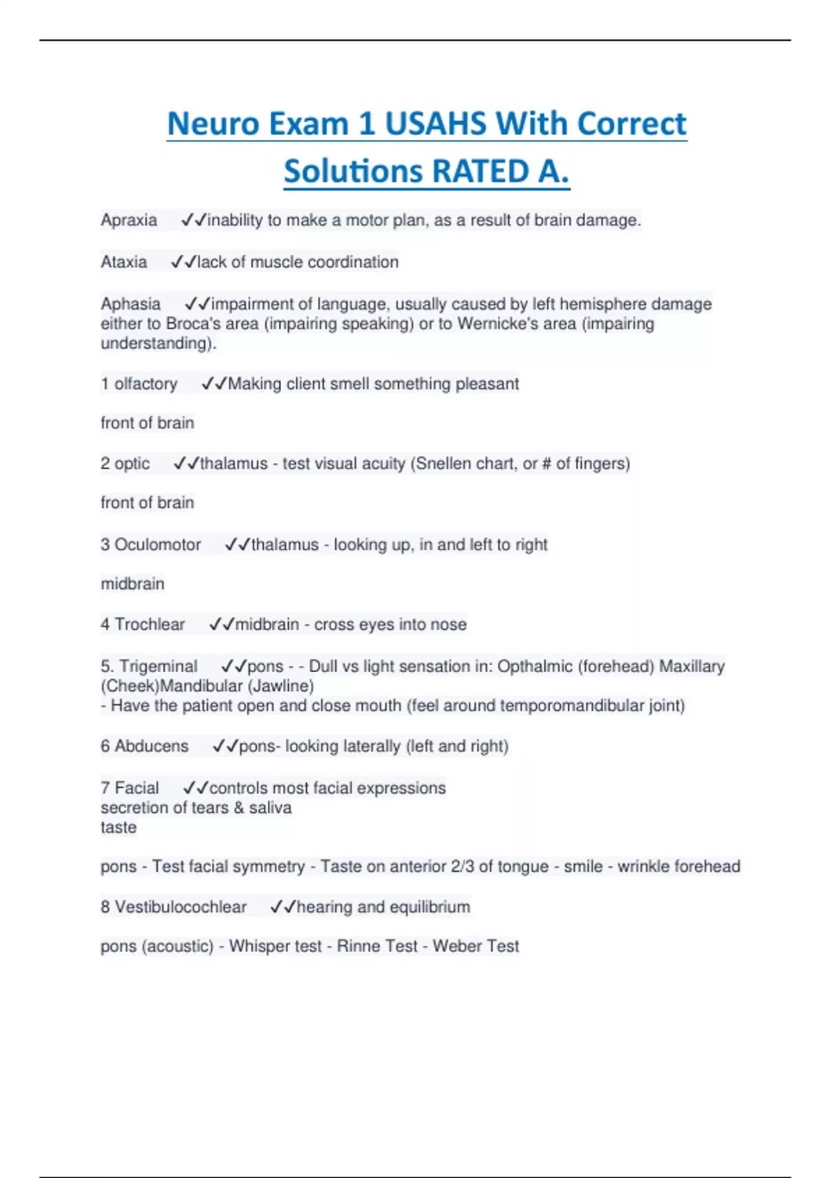 Neuro Exam 1 USAHS With Correct Solutions RATED A.