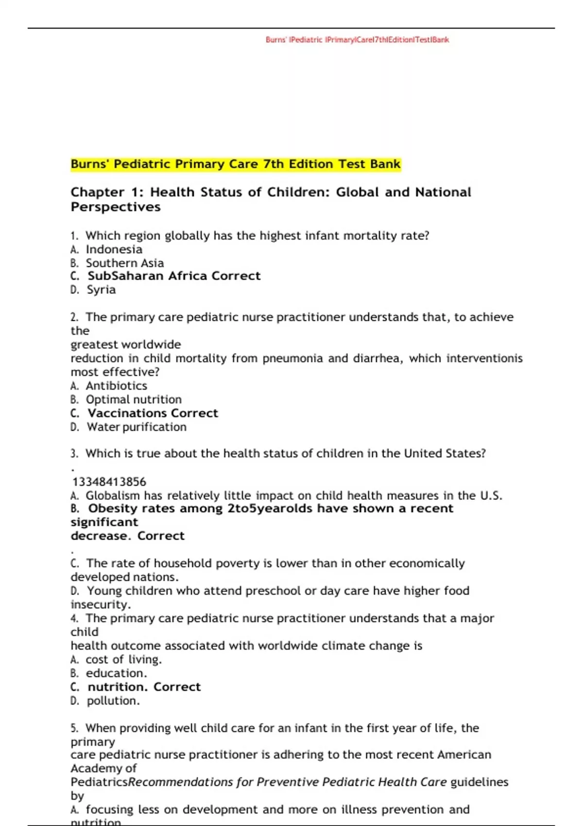 Burns' Pediatric Primary Care 7th Edition Test Bank Chapter 1: Health Status of Children: Global and National Perspectives 1. Which region globally has the highest infant mortality rate? A. Indonesia B. Southern Asia C. SubSaharan Africa Correct D. Syria 2. The primary care pediatric nurse practitioner understands that, to achieve the greatest worldwide reduction in child mortality from pneumonia and diarrhea, which interventionis most effective? A. Antibiotics B. Optimal nutrition C. Vaccinations Correct D. Water purification 3. Which is true about the health status of children in the United States? . A. Globalism has relatively little impact on child health measures in the U.S. B. Obesity rates among 2to5yearolds have shown a recent significant decrease. Correct . C. The rate of household poverty is lower than in other economically developed nations. D. Young children who attend preschool or day care have higher food insecurity. 4. The primary care pediatric nurse practitioner understands that a major child health outcome associated with worldwide climate change is A. cost of living. B. education. C. nutrition. Correct D. pollution. 5. When providing well child care for an infant in the first year of life, the primary care pediatric nurse practitioner is adhering to the most recent American Academy of PediatricsRecommendations for Preventive Pediatric Health Care guidelines by A. focusing less on development and more on illness prevention and nutrition. B. following guidelines established by theBright Futures publication. C. scheduling wellbaby visits to coincide with key developmental milestones. Correct D. seeing the infant at ages 2, 4, 6, and 12 months when immunizations are due. Chapter 2. Unique Issues in Pediatrics 1. A nurse is explaining the therapeutic milieu to a new nurse. The best explanation of this term would be: Burns' IPediatric IPrimaryICareI7thIEditionITestIBank 1. The place where the child is receiving care. Burns' IPediatric IPrimaryICareI7thIEditionITestIBank 2. Group therapy. 3. Personal interactions between patients and staff. 4. All of the above are correct. ANS: 4 2. A 16-year-old male has received a pink-slip from the police for inpatient psychiatric treatment. The teen has been expressing thoughts of hanging himself because Life sucks. Thenursing staff should consider placing the child: 1. With peers. 2. In an area where he can be watched one-on-one. 3. With aroommate thatisexpressing the sameconcerns. 4. In an area close to an external door. ANS: 2 3. Learning disabilities in children have scientifically been linked to: 1. Poornutrition. 2. The environment in which the child lives. 3. Genetics. 4. Watching more than four hours of television a day. ANS: 3 4. A mental health nurse has assessed a child and determined that the child exhibits behavioral challenges. When the school nurse explains this to a teacher, the best description wouldbe: . 1. The child may exhibit physical outbursts. 2. The child may exhibit violence toward others. 3. The child may be defiant or have tantrums. 4. The child will need special interventions for learning. ANS: 3 5. A child that has not exhibited enuresis in four years has exhibited this behavior pattern for the last week. The reason a child may revert back to this behavior pattern is because of: 1. Hallucinations. 2. Behavioral challenges. 3. Delusions. 4. Stress. ANS: 4 6. An 18-year-old male has called the crisis line for help. The crisis nurse recognizes the intervention needs may consist of all of the following except: 1. Discussing the individuals everyday activities. 2. Recognizing that the patient may be in a catharsis state. 3. Expressing empathy toward the caller. 4. Avoiding entropy. ANS: 1 7. An 8-year-old boy with a history of hallucinations and violent behavior has been place in a seclusion room at the hospital because he has been hurting others. The nurse checks on the patient and realizes she must take him out of the seclusion room when: 1. He is crying to be released