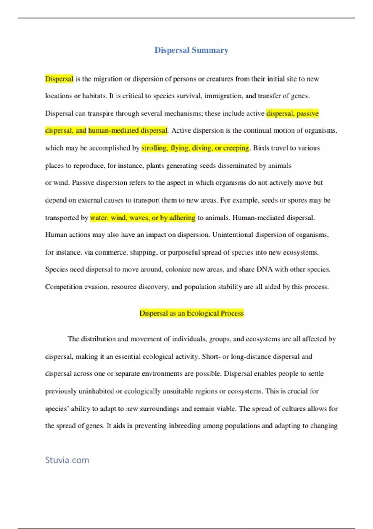 Dispersal is the migration or dispersion of persons or creatures from their initial site to new locations or habitats. It is critical to species survival, immigration, and transfer of genes. Dispersal can transpire through several mechanisms; these include active dispersal, passive dispersal, and human-mediated dispersal