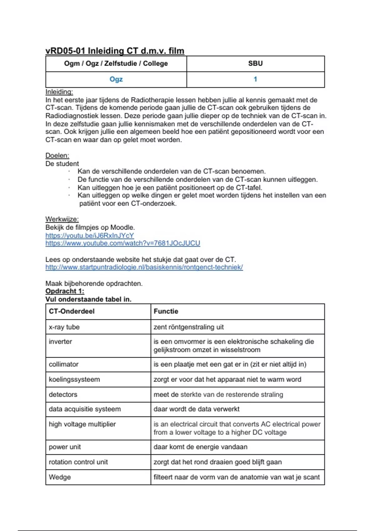 · De functie van de verschillende onderdelen van de CT-scan kunnen uitleggen.