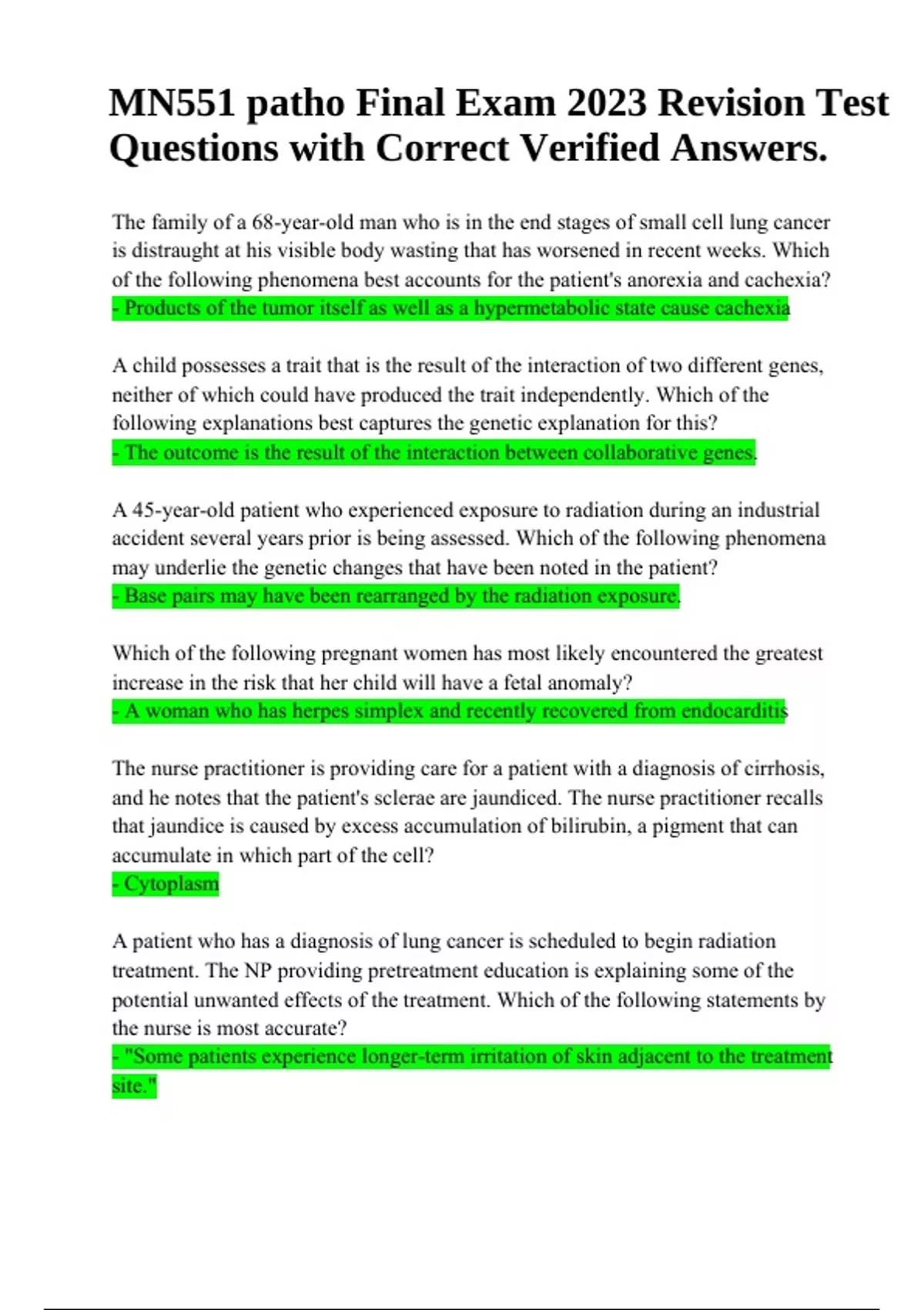 MN551 Patho Final Exam 2023 Revision Test Questions with Correct Verified Answers. The family of a 68-year-old man who is in the end stages of small cell lung cancer is distraught at his visible body wasting that has worsened in recent weeks. Which of the following phenomena best accounts for the patient's anorexia and cachexia? - Products of the tumor itself as well as a hypermetabolic state cause cachexia A child possesses a trait that is the result of the interaction of two different genes, neither of which could have produced the trait independently. Which of the following explanations best captures the genetic explanation for this? - The outcome is the result of the interaction between collaborative genes. A 45-year-old patient who experienced exposure to radiation during an industrial accident several years prior is being assessed. Which of the following phenomena may underlie the genetic changes that have been noted in the patient? - Base pairs may have been rearranged by the radiation exposure. Which of the following pregnant women has most likely encountered the greatest increase in the risk that her child will have a fetal anomaly? - A woman who has herpes simplex and recently recovered from endocarditis The nurse practitioner is providing care for a patient with a diagnosis of cirrhosis, and he notes that the patient's sclerae are jaundiced. The nurse practitioner recalls that jaundice is caused by excess accumulation of bilirubin, a pigment that can accumulate in which part of the cell? - Cytoplasm A patient who has a diagnosis of lung cancer is scheduled to begin radiation treatment. The NP providing pretreatment education is explaining some of the potential unwanted effects of the treatment. Which of the following statements by the nurse is most accurate? - "Some patients experience longer-term irritation of skin adjacent to the treatment site." MN551 patho Final Exam 2023 Revision Test Questions with Correct Verified Answers. A male patient of a nurse practitioner has an autosomal dominant disorder. The patient and his partner are considering starting a family. Which of the patient's following statements indicates the patient has an adequate understanding of the genetic basis of this health problem? - "I know that a single mutant allele is to blame for the health problem." A group of researchers has identified that the prevalence of two particular genetic disorders share a statistical correlation. Which of the following statements best conveys the genetic rationale for this situation? - The genes causing each disorder are likely in the same section of the same chromosome. The NP is working with a family whose daughter has been recently diagnosed with the chromosomal disorder Turner syndrome. The NP would recognize that which of the following statements about the characteristics of human chromosomes is accurate? - Autosomes contain the determination of an individual's sex. The NP is teaching a group of older adults about the value of including foods containing antioxidants in their diet. Which of the following statements best captures the rationale underlying the NPs advice? - Antioxidants inhibit the actions of reactive oxygen species (ROS). Which target of both chemotherapy and radiation treatment accounts for adverse as well as therapeutic effects? - Rapidly proliferating cells Which of the following patients of a primary care nurse practitioner would not require extra screening for cancer? - A 38-year-old female with Down syndrome and congenital scoliosis A 7-year-old boy is admitted to the hospital with a suspected diagnosis of lead toxicity. Which of the following assessment findings is most congruent with the patient's diagnosis? - Hemoglobin 9.9 g/dL The NP is providing care for a 21-year-old female patient with gas gangrene of a compound fracture in her arm. Which of the following assessment findings would the nurse most reasonably expect to find when caring for a patient with a diagnosis of gas gangrene? - Spreading edema A community health nurse practitioner is teaching a group of female high school students about the importance of regular Papanicolaou (Pap) smears. The nurse recognizes that which of the following items underlies the rationale for this teaching? - Cancer of the uterine cervix develops incrementally at a cellular level. Which of the following statements most accurately conveys an aspect of cell injury due to impaired calcium homeostasis? - Injured cells tend to accumulate calcium. A woman is surprised to read on the Internet that certain infections can cause cancer and has sought clarification from her nurse practitioner during an office visit. How can the NP best respond to the woman's query? - "There are many viruses, but only a very few of them have been shown to cause cancer in humans." The nurse practitioner working in occupational health has been asked to speak to a group of factory workers about the importance of wearing gloves when working with strong chemicals such as turpentine and paint thinner. Which of the following characteristics of cell membranes underlies the nurse's teaching? - Cell membranes are impermeable to all but lipid-soluble substances. A 6-year-old girl with a diagnosis of Marfan syndrome is being assessed at a community health clinic. Which of the following assessments would be the health care professional's lowest priority? - Tests of kidney function.