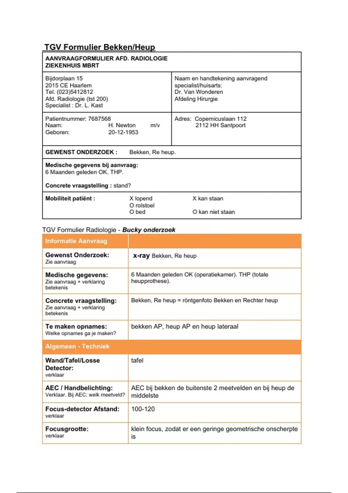Concrete vraagstelling: Bekken, Re heup = röntgenfoto Bekken en Rechter heup