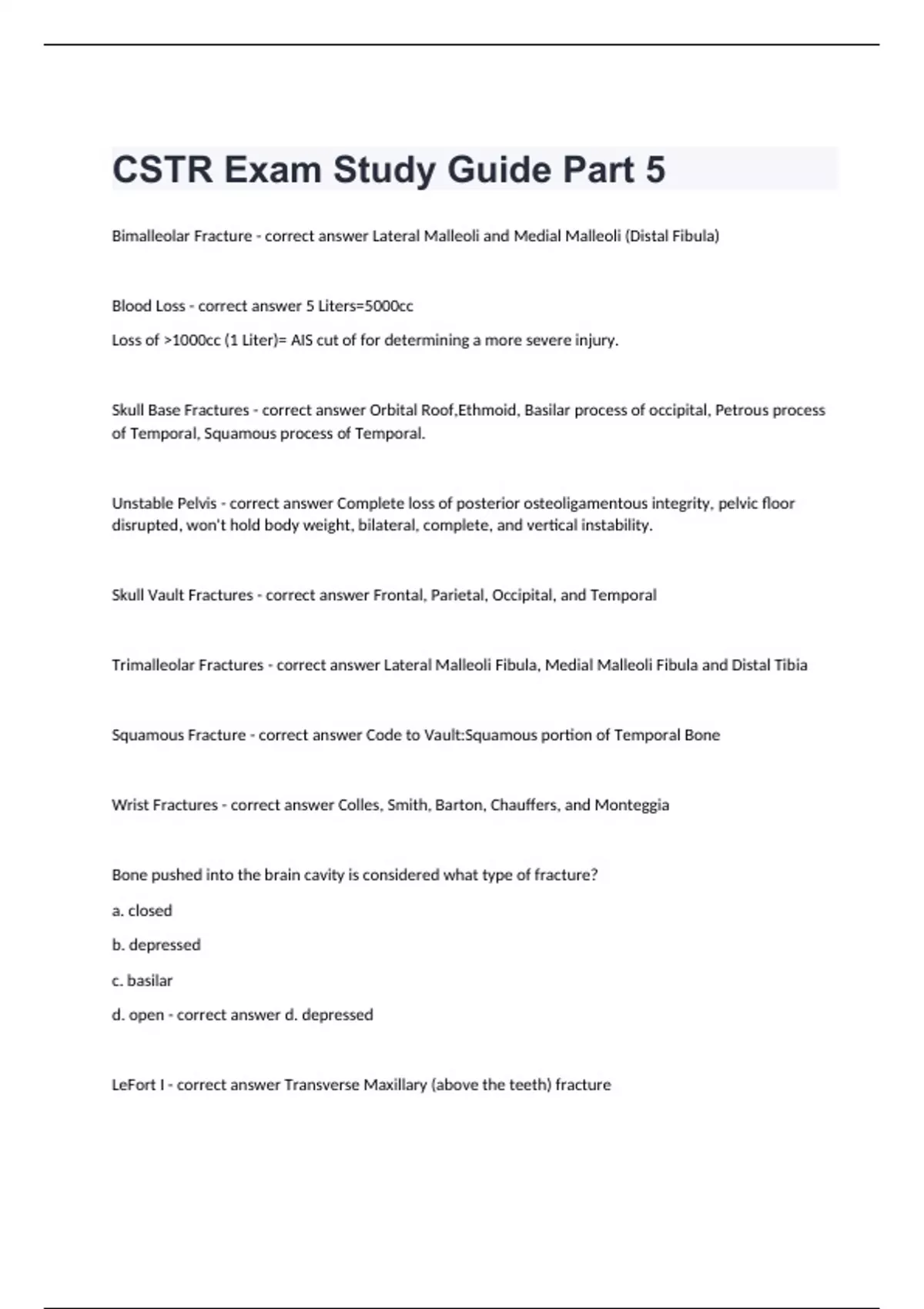 CSTR Exam Study Guide Part 5Bimalleolar Fracture - correct answer Lateral Malleoli and Medial Malleoli (Distal Fibula) Blood Loss - correct answer 5 Liters=5000cc Loss of 1000cc (1 Liter)= AIS cut of for determining a more severe injury. Skull Base Fractures - correct answer Orbital Roof,Ethmoid, Basilar process of occipital, Petrous process of Temporal, Squamous process of Temporal. Unstable Pelvis - correct answer Complete loss of posterior osteoligamentous integrity, pelvic floor disrupted, won't hold body weight, bilateral, complete, and vertical instability. Skull Vault Fractures - correct answer Frontal, Parietal, Occipital, and Temporal Trimalleolar Fractures - correct answer Lateral Malleoli Fibula, Medial Malleoli Fibula and Distal Tibia Squamous Fracture - correct answer Code to Vault:Squamous portion of Temporal Bone Wrist Fractures - correct answer Colles, Smith, Barton, Chauffers, and Monteggia Bone pushed into the brain cavity is considered what type of fracture? a. closed b. depressed c. basilar d. open - correct answer d. depressed LeFort I - correct answer Transverse Maxillary (above the teeth) fracture