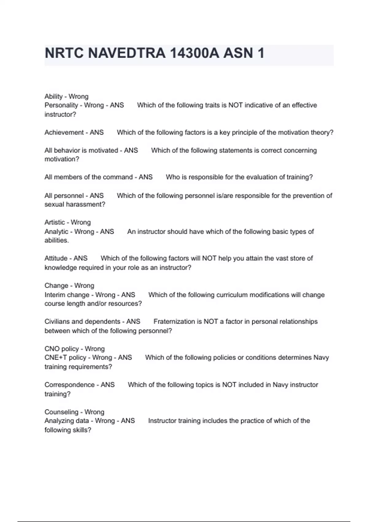 NRTC NAVEDTRA 14300A ASN 1NRTC NAVEDTRA 14300A ASN 1 Ability - Wrong Personality - Wrong - ANS Which of the following traits is NOT indicative of an effective instructor? Achievement - ANS Which of the following factors is a key principle of the motivation theory? All behavior is motivated - ANS Which of the following statements is correct concerning motivation? All members of the command - ANS Who is responsible for the evaluation of training? All personnel - ANS Which of the following personnel is/are responsible for the prevention of sexual harassment? Artistic - Wrong Analytic - Wrong - ANS An instructor should have which of the following basic types of abilities. Attitude - ANS Which of the following factors will NOT help you attain the vast store of knowledge required in your role as an instructor? Change - Wrong Interim change - Wrong - ANS Which of the following curriculum modifications will change course length and/or resources? Civilians and dependents - ANS Fraternization is NOT a factor in personal relationships between which of the following personnel? CNO policy - Wrong CNE+T policy - Wrong - ANS Which of the following policies or conditions determines Navy training requirements? Correspondence - ANS Which of the following topics is NOT included in Navy instructor training? Counseling - Wrong Analyzing data - Wrong - ANS Instructor training includes the practice of which of the following skills? Dating - ANS Which of the following acts does NOT constitute sexual harassment? Direction - Wrong - ANS A Navy instructor should exhibit leadership by what method? Don't Bluff - ANS Which of the following rules of conduct should an instructor follow? Drives - Wrong Values - Wrong - ANS Which of the following motivation principles refers to a person's view of an activity as worthwhile? Engaging in sexual harassment - ANS Which of the following practices undermines the integrity of the instructor-student relationship? Establish Goals - ANS Which of the following examples is a technique of motivation? False - ANS As an instructor you should conduct training to meet the needs of the individual, not the Navy. False - ANS Once a training requirement is validated, curriculum managers determine if the required training is available. False - ANS Students can rely upon their instructors to provide necessary motivation for success in learning. False - ANS The art of instruction cannot be developed, it must be taught. False - ANS The goal of instruction is to motivate students to achieve personal objectives. False - ANS The Navy training system is a relatively simple system False - ANS The responsibility of instructors of Navy training courses is to develop curriculum. False - ANS Two-thirds of all people in the Navy are involved in some kind of training at any one time. False - ANS You are likely to be assigned curriculum development duties as an instructor. False - ANS You should view your students as being immature and adjust your instruction accordingly. Filling out Billets - Wrong Classroom Management - Wrong - ANS What is the primary concern of training management? Fraternization - ANS What is the traditional term used to identify personal relationships that violate the customary bounds of acceptable senior-subordinate relationships? HPSM - ANS Which of the following is NOT a key component of the ILE? Instruction and course - Wrong Feedback and Evaluation - Wrong - ANS Training evaluation is divided into which of the following categories? Instructors - ANS Who has responsibility for classroom management? Interaction with students - ANS What is your greatest source of information in helping students learn? Interest level - Wrong Personal values - Wrong - ANS Which of the following characteristics would you draw on to capture a student's interest? Motivational - ANS As a Navy instructor you can increase a students desire to learn by creatively using which of the following techniques? Need - ANS A deficit or lack that causes a desire for satisfaction is defined as a. Needs - ANS To provide appropriate incentives for students to learn, you should identify which of the following factors? NSC - ANS Which of the following commands issues policy to ensure safety in the training environment? Personnel property cleared with a need to know only - ANS When teaching, you should disclose classified information to which of the following personnel? Program Manager - ANS Who is responsible for the development of new course materials? Provide the outside interest - Wrong Be appealing and well-equipped - Wrong - ANS The environment is which learning is to take place should meet which of the following requirements? Relate personal experiences - Wrong Give students detailed feedback - Wrong - ANS Which of the following actions should you take to generate student interests? Relevance - ANS Which of the following Keller ARCS model principles motivates learners by connecting the objective to what they will be doing on the job? Resources - ANS Which of the following elements of curriculum development is NOT affected by a technical change? Respect you as an instructor - ANS Displaying a professional attitude as an instructor causes students to. Safety - ANS Which of the following factors is an integral part of the Naval Education and Training Command? Safety programs - Wrong Attrition and setback data - Wrong - ANS Which of the following elements is NOT part of the internal evaluation of a course of instruction? Sarcasm - ANS Which of the following personal traits could cause you to lose the respect of your students? Self-actualization - ANS Which of the following factors is a growth need? Set a good example - Wrong Teach experiences - Wrong - ANS Which of the following responsibilities do you have to your students? Sexual Harassment - ANS Verbal or physical contact of an offensive nature is considered to be. Submit a course description - ANS During training development, the functional commander and the training a