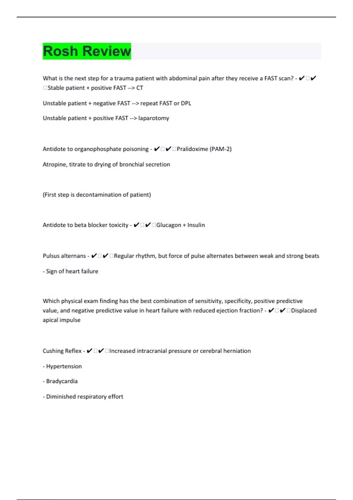 What is the next step for a trauma patient with abdominal pain after they receive a FAST scan? - ️️Stable patient + positive FAST --> CT Unstable patient + negative FAST --> repeat FAST or DPL Unstable patient + positive FAST --> laparotomy Antidote to organophosphate poisoning - ️️Pralidoxime (PAM-2) Atropine, titrate to drying of bronchial secretion (First step is decontamination of patient) Antidote to beta blocker toxicity - ️️Glucagon + Insulin Pulsus alternans - ️️Regular rhythm, but force of pulse alternates between weak and strong beats - Sign of heart failure Which physical exam finding has the best combination of sensitivity, specificity, positive predictive value, and negative predictive value in heart failure with reduced ejection fraction? - ️️Displaced apical impulse Cushing Reflex - ️️Increased intracranial pressure or cerebral herniation - Hypertension - Bradycardia - Diminished respiratory effort