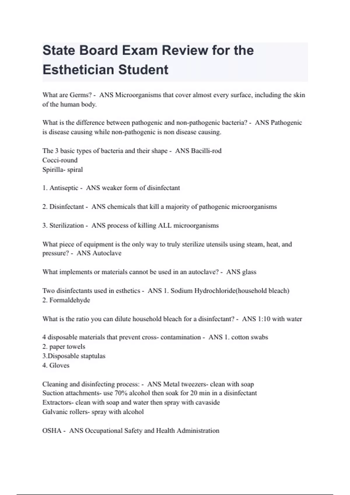 State Board Exam Review for the Esthetician Student Questions with correct Answers 2024 (A+GRADED 100% VERIFIED)