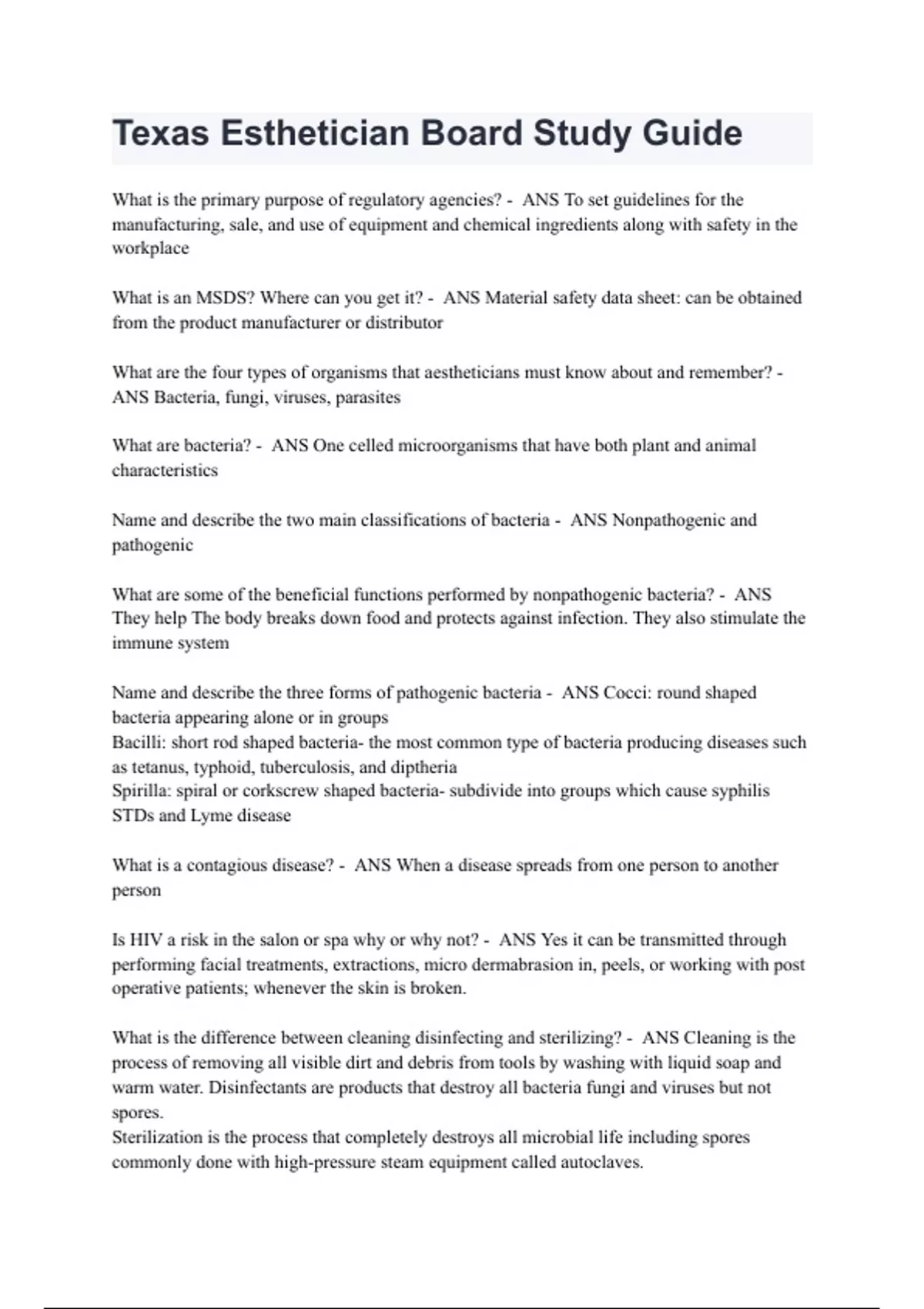 Texas Esthetician Board Study Guide Questions with correct Answers 2024 (A+ GRADED 100% VERIFIED)