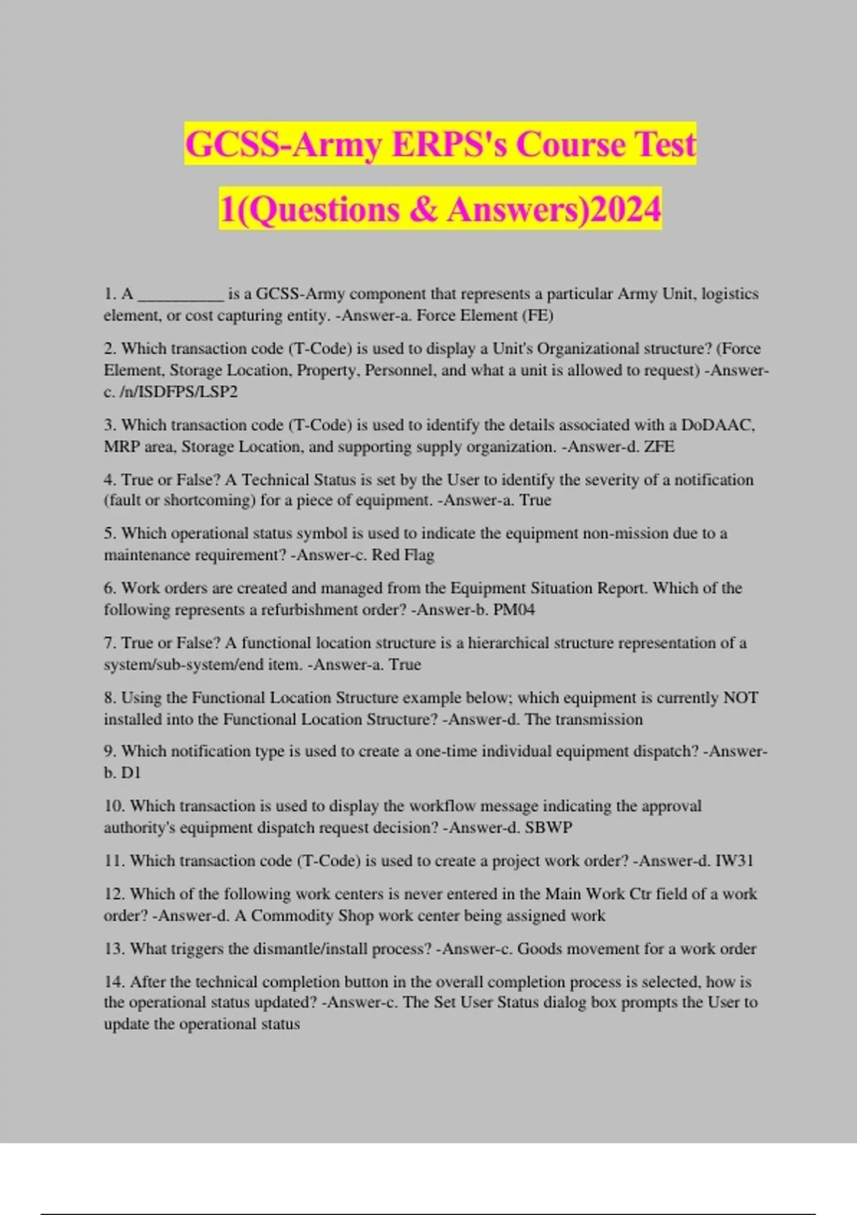 GCSS-Army ERPS's Course Test 1(Questions & Answers)2024 1. A __________ is a GCSS-Army component that represents a particular Army Unit, logistics element, or cost capturing entity. -Answer-a. Force Element (FE) 2. Which transaction code (T-Code) is used to display a Unit's Organizational structure? (Force Element, Storage Location, Property, Personnel, and what a unit is allowed to request) -Answer- c. /n/ISDFPS/LSP2 3. Which transaction code (T-Code) is used to identify the details associated with a DoDAAC, MRP area, Storage Location, and supporting supply organization. -Answer-d. ZFE 4. True or False? A Technical Status is set by the User to identify the severity of a notification (fault or shortcoming) for a piece of equipment. -Answer-a. True 5. Which operational status symbol is used to indicate the equipment non-mission due to a maintenance requirement? -Answer-c. Red Flag 6. Work orders are created and managed from the Equipment Situation Report. Which of the following represents a refurbishment order? -Answer-b. PM04 7. True or False? A functional location structure is a hierarchical structure representation of a system/sub-system/end item. -Answer-a. True